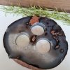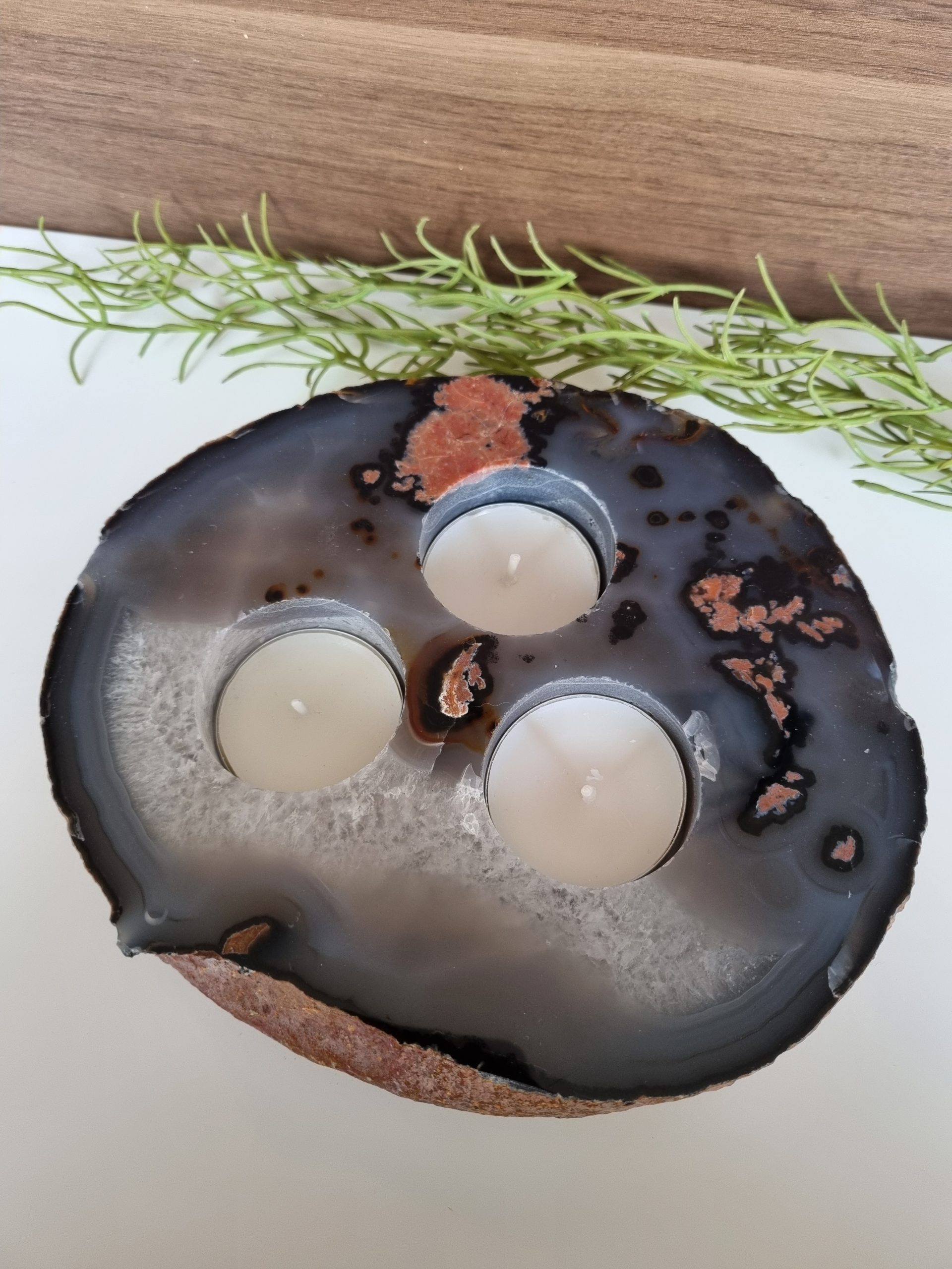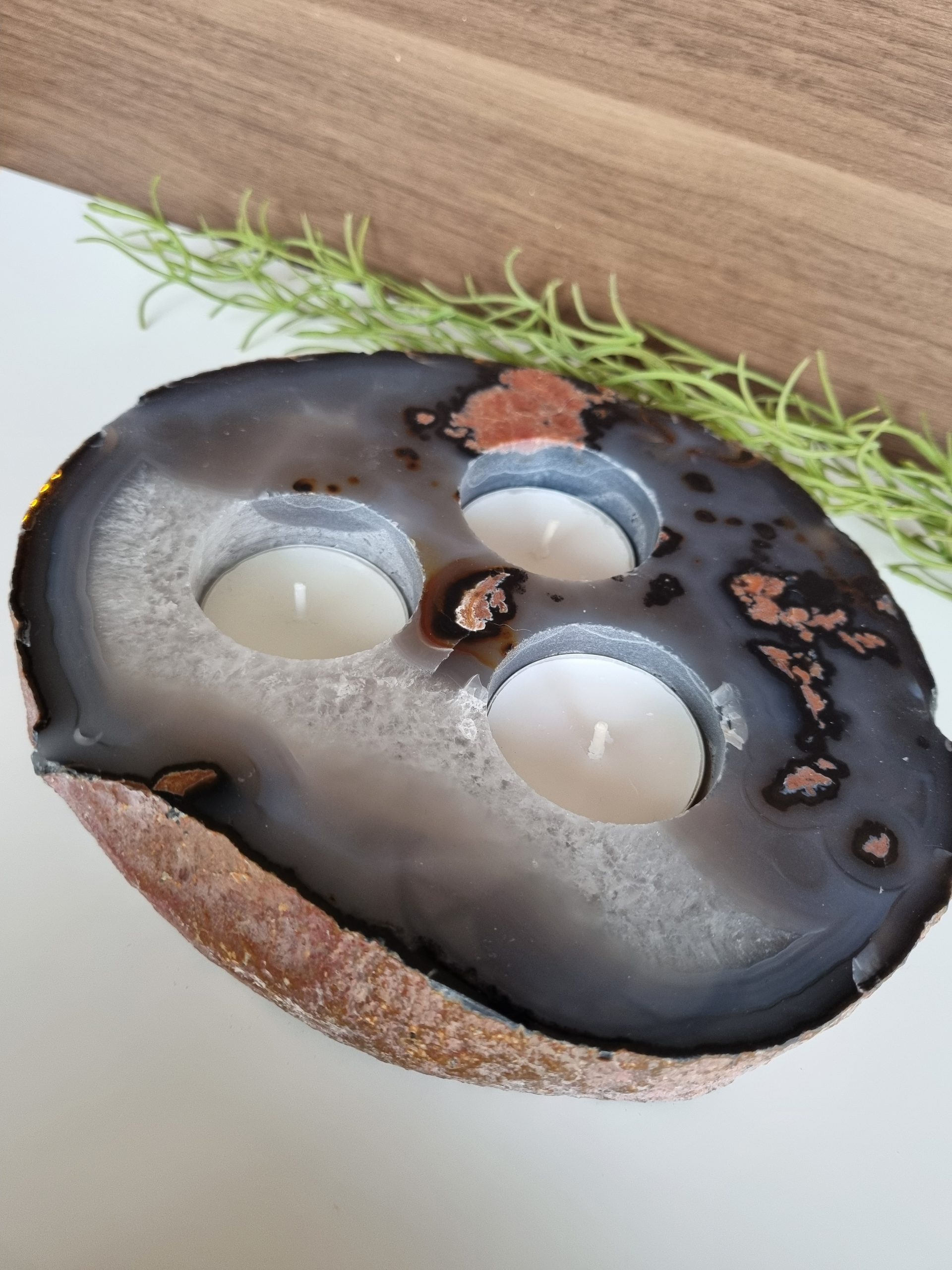 Deze dikke agaatschijf is voorzien van een gat voor een waxinelichtje.