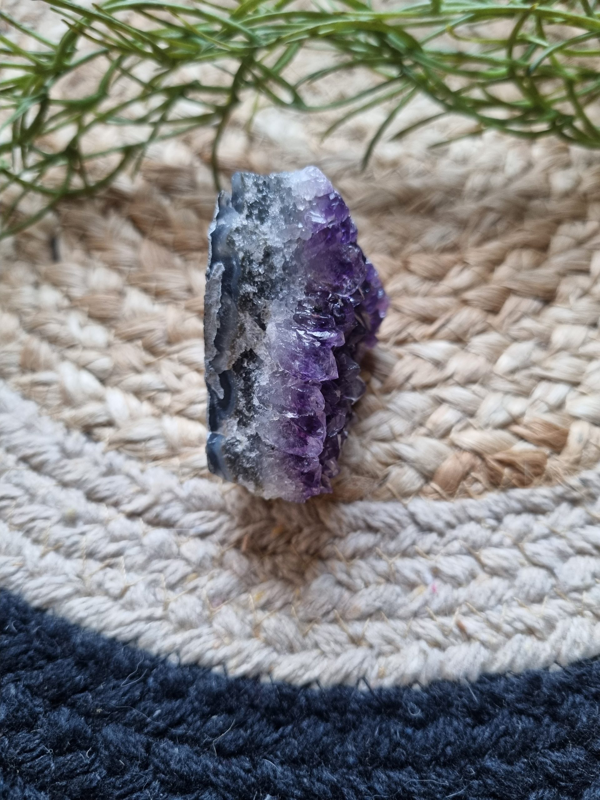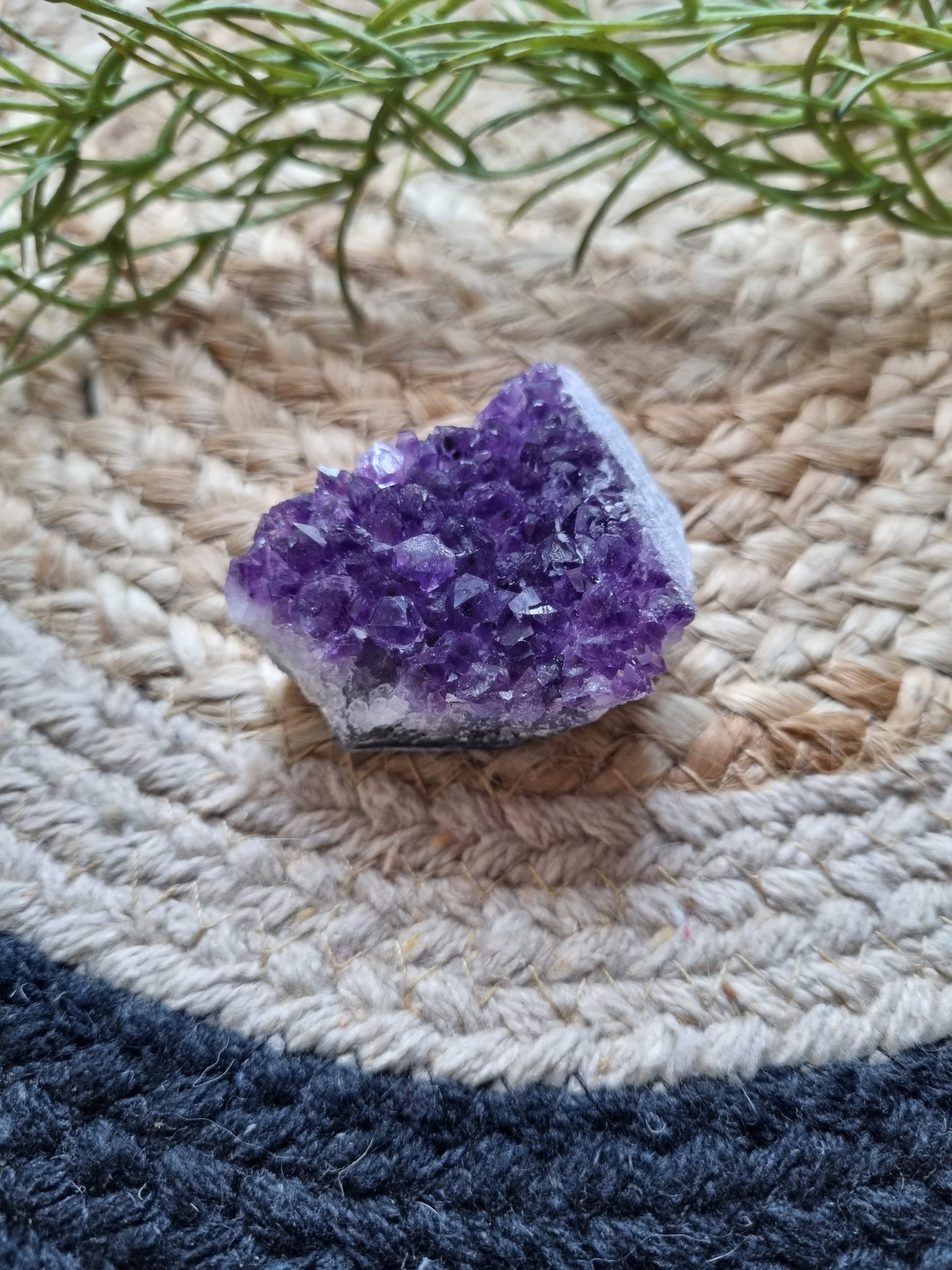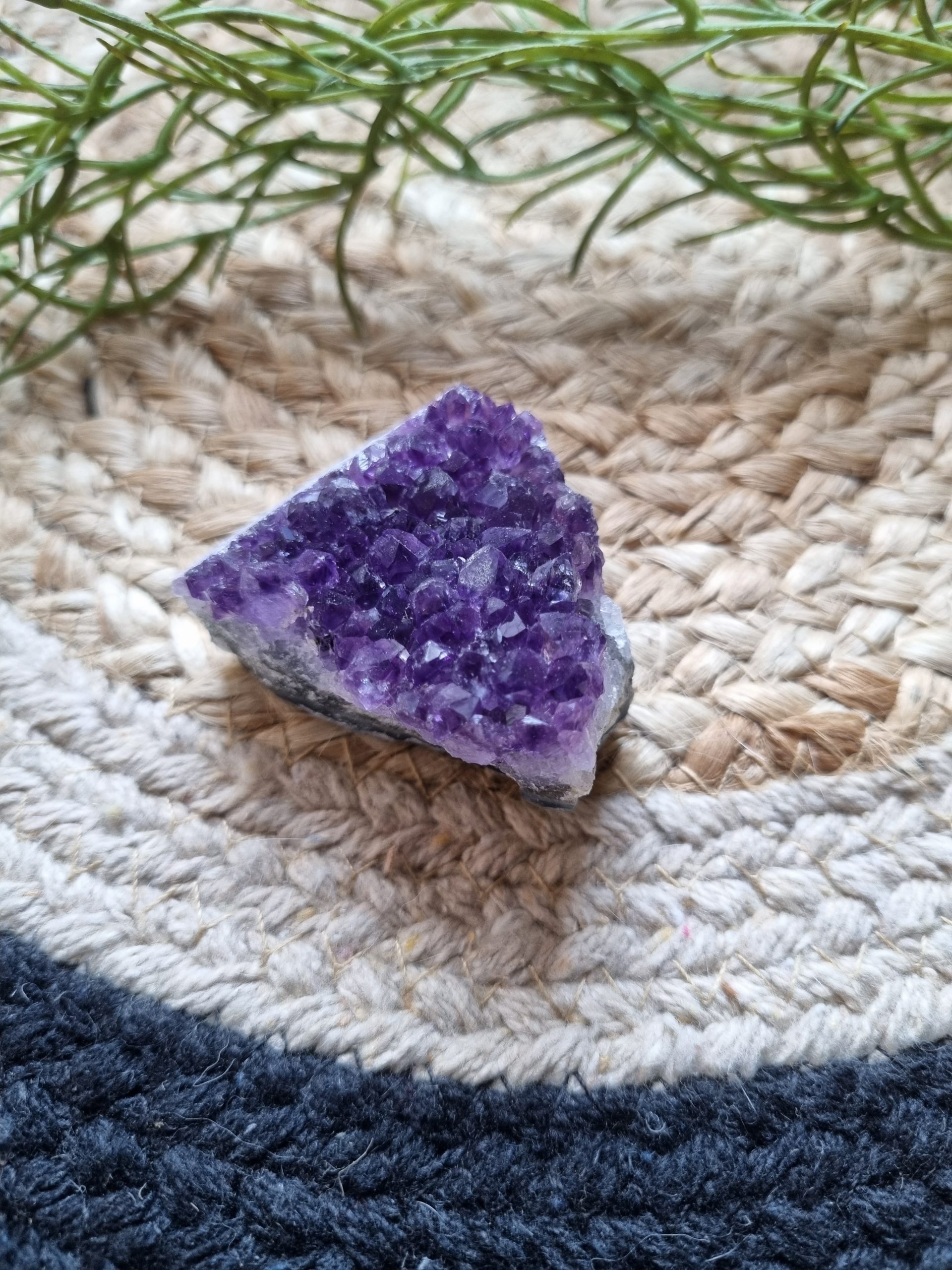 Dit amethist cluster van 50 gram heeft donker paarse kristallen.