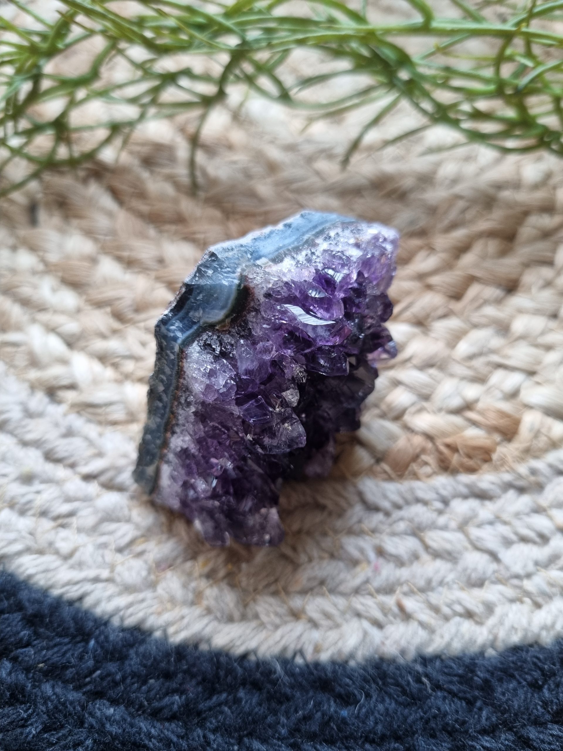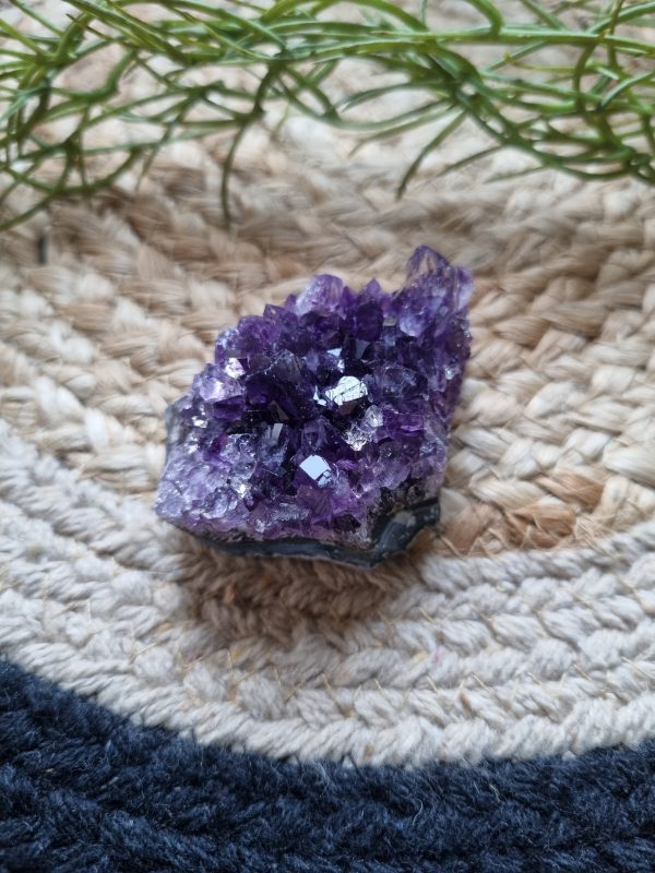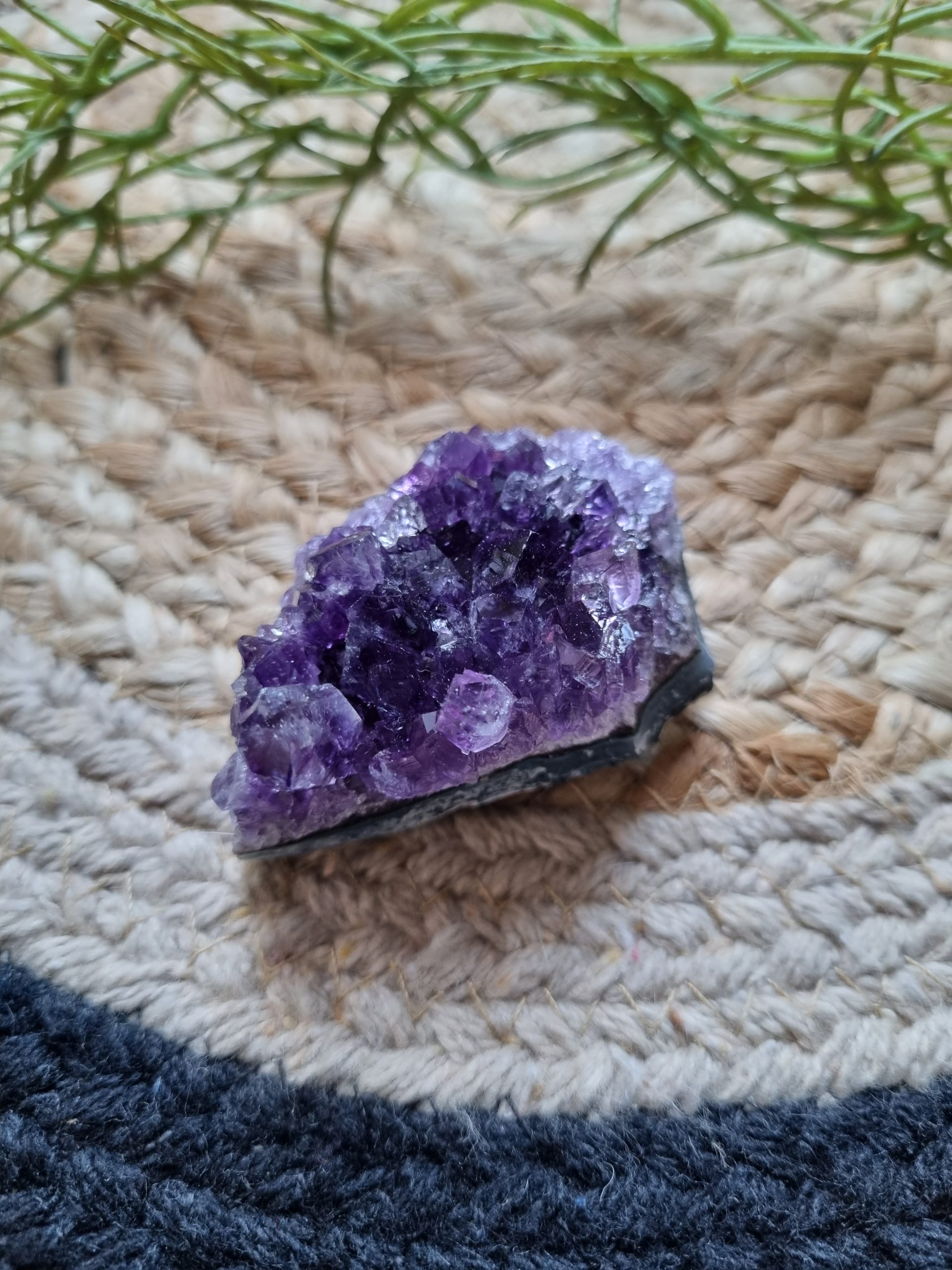 Dit amethist cluster van 56 gram heeft donker paarse kristallen.
