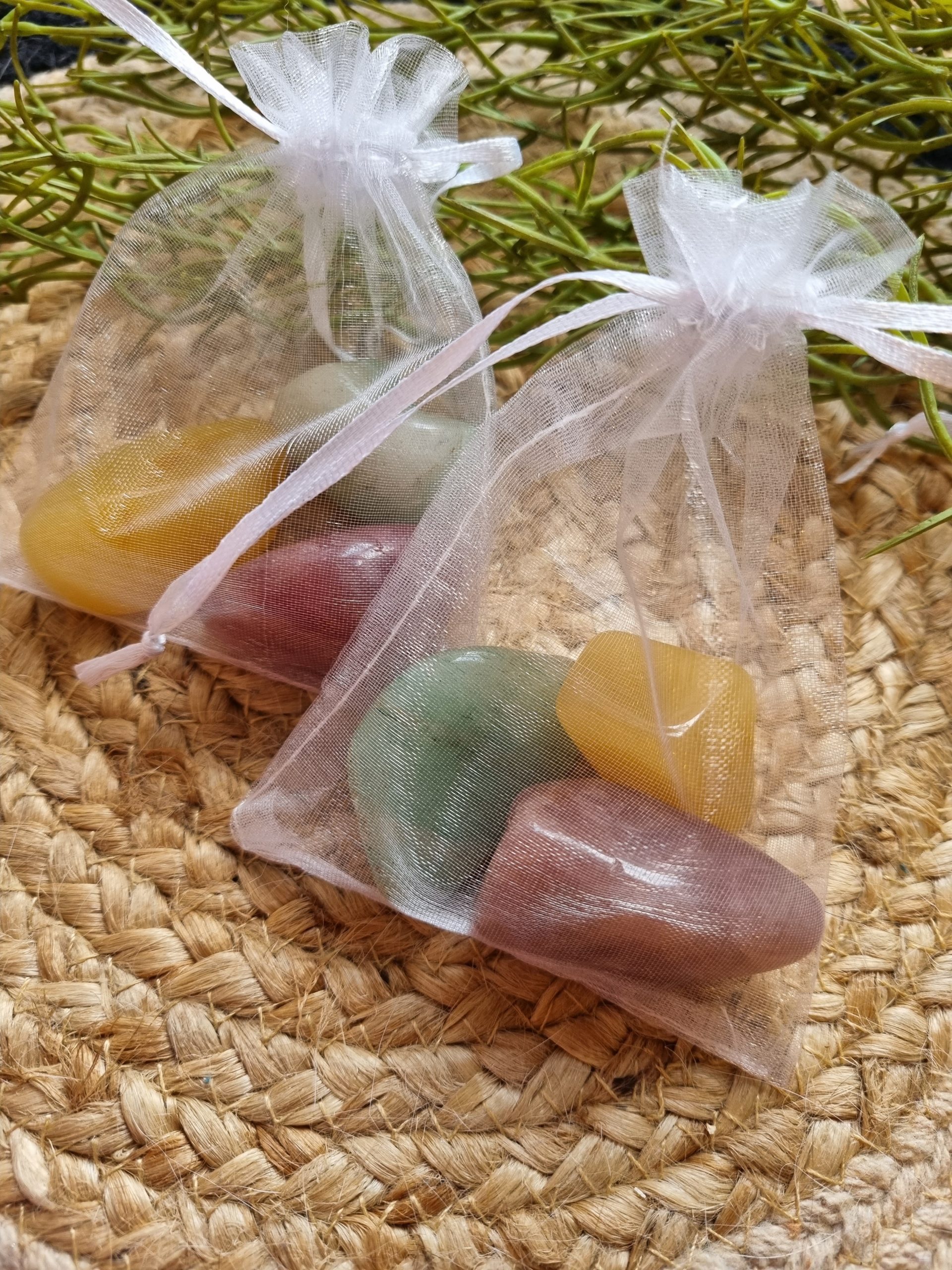 Deze set van trommelstenen bevat drie varianten aventurijn: gele, groene en rode. Aventurijn is een kwartsvariëteit die bekend staat om haar glitterende textuur en haar kracht om welvaart en geluk aan te trekken. Gele aventurijn zorgt voor een kalmerend gevoel en bevordert een algeheel welzijn. Groene aventurijn staat bekend om haar helende en beschermende eigenschappen. Rode aventurijn stimuleert vitaliteit en fysieke kracht.