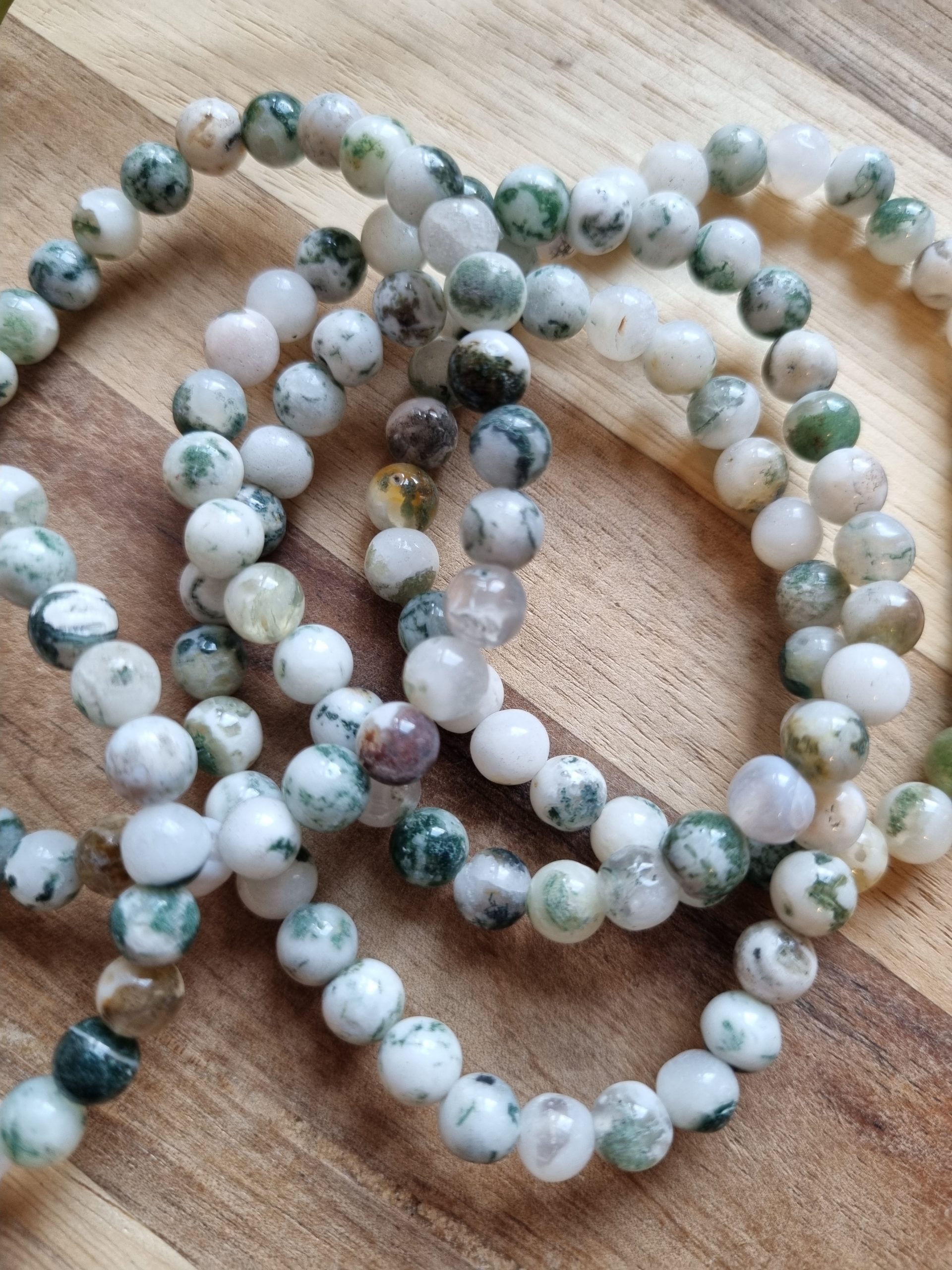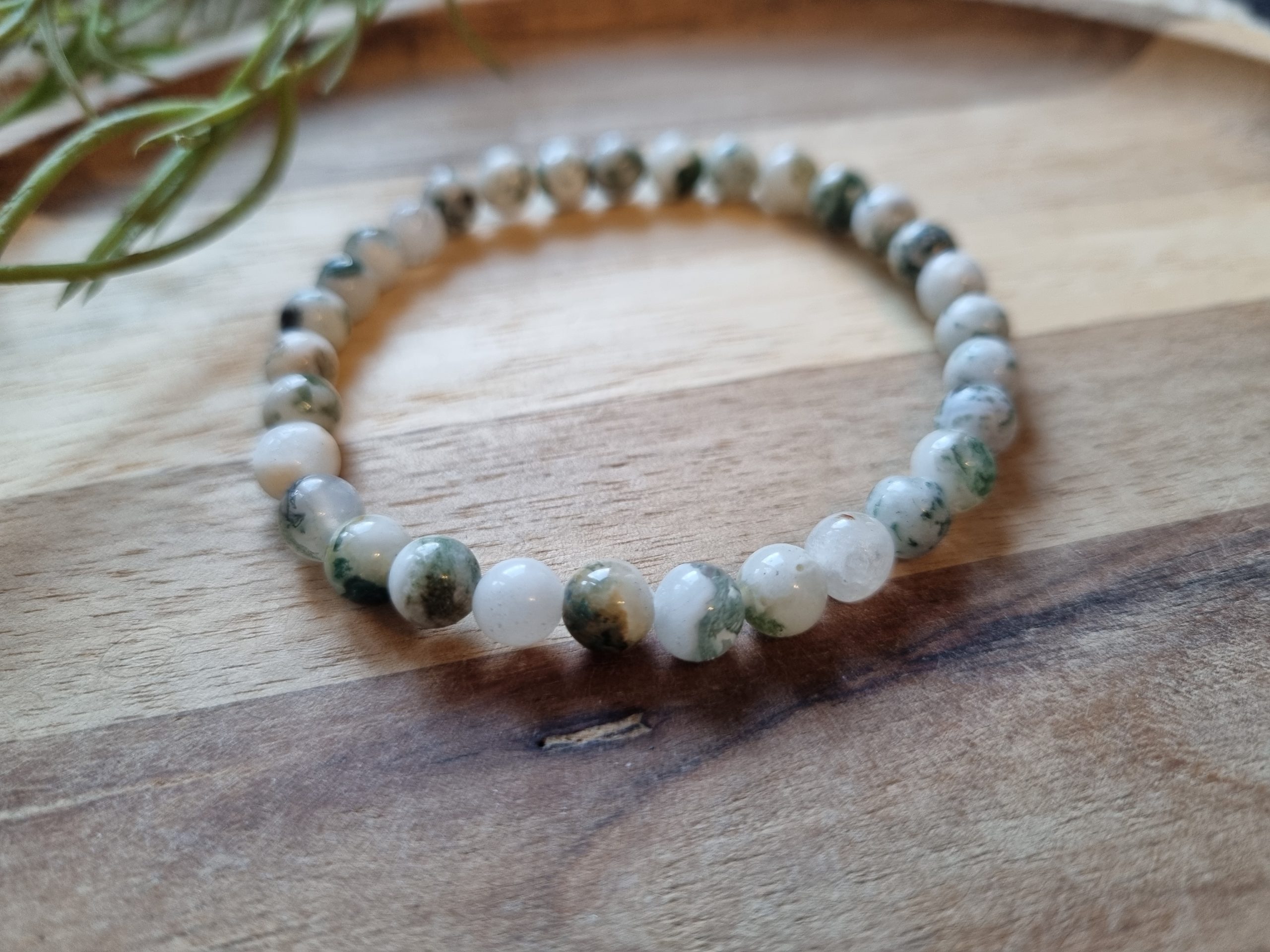 Deze boomagaat armband bestaat uit gladde 6mm kralen met natuurlijke patronen die lijken op boomtakken, waardoor elk stuk uniek en aantrekkelijk is. Boomagaat staat bekend om haar kalmerende en stabiliserende eigenschappen, en helpt bij het bevorderen van innerlijke rust, harmonie en een diepe connectie met de natuur. Ze ondersteunt gevoelens van stabiliteit, persoonlijke groei en voortdurende transformatie. Draag deze armband als een symbool van kalmte en verbondenheid met de natuur, en herinner jezelf aan de voortdurende groei die in ons allemaal mogelijk is.