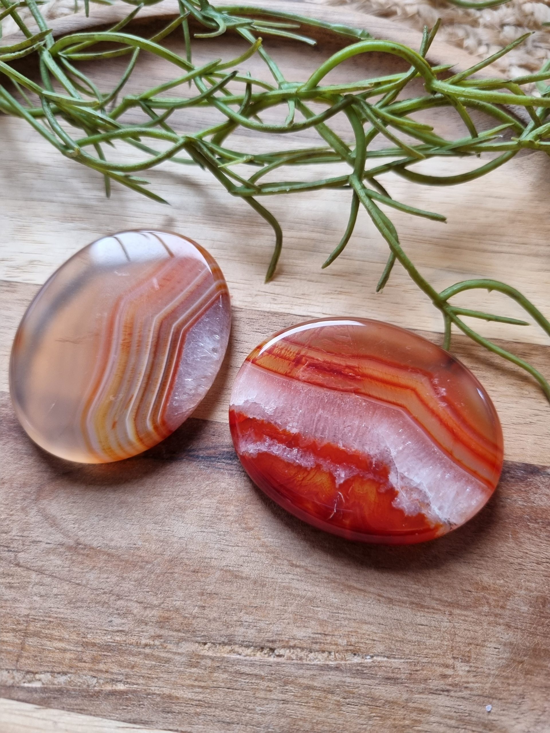 Deze plat gepolijste carneool zakstenen stralen een warme oranje tot roodbruine tint uit. Ze zijn ideaal om mee te nemen in je zak of tas en ondersteunen je in het versterken van innerlijke kracht en motivatie.