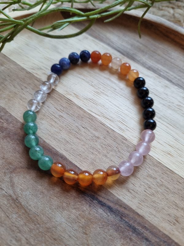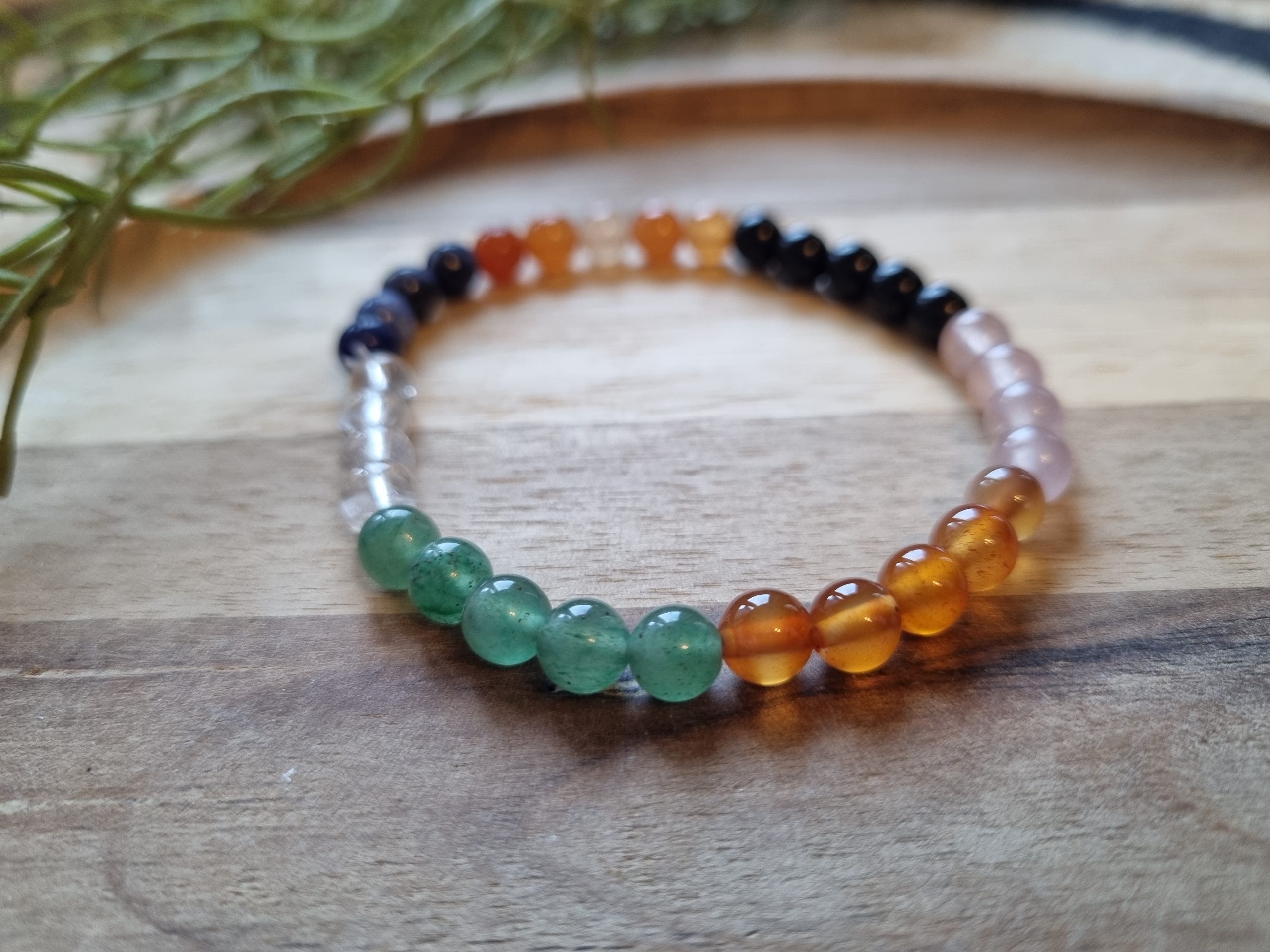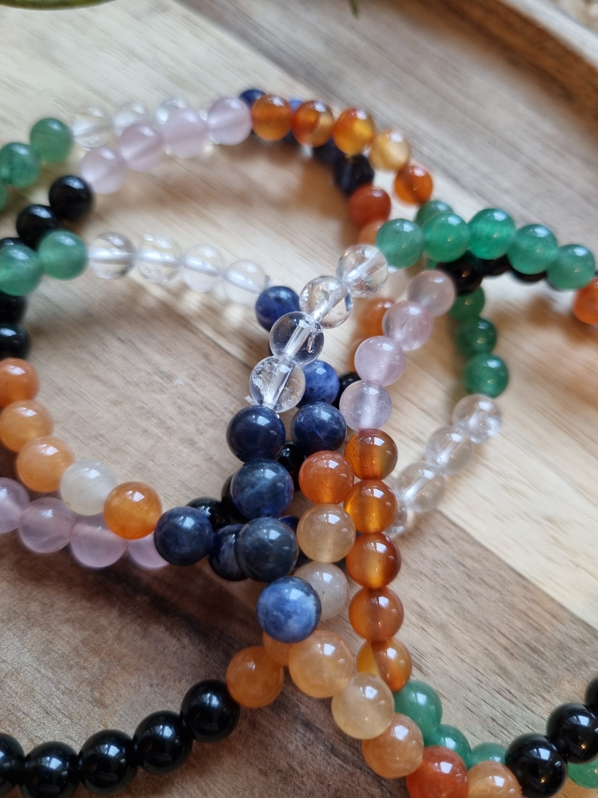 De stenen, waaronder rozenkwarts, bergkristal, sodaliet, groene aventurijn, carneool, obsidiaan en oranje aventurijn, ondersteunen een positieve en harmonieuze energiestroom in je lichaam. Ze staan bekend om hun helende eigenschappen en kunnen je helpen bij het bevorderen van rust, liefde, intuïtie, vitaliteit en zelfvertrouwen.