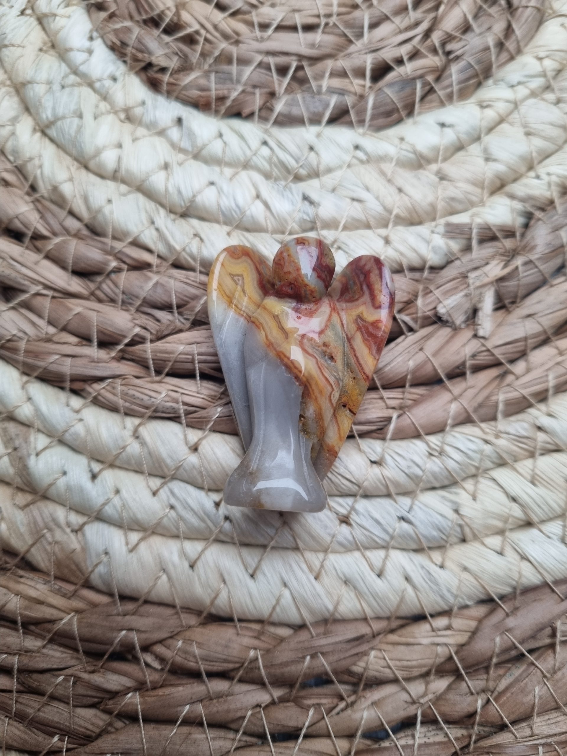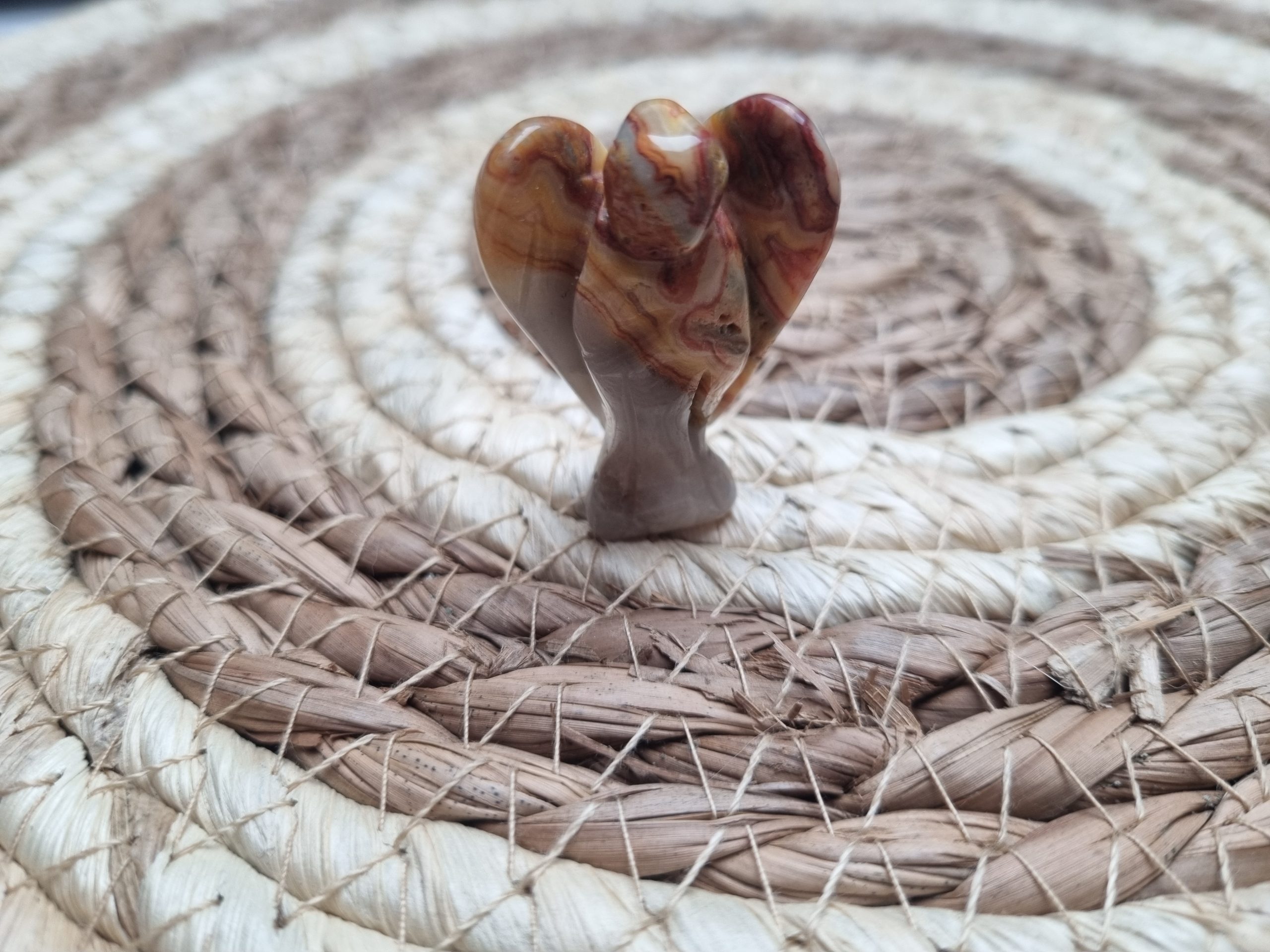 Dit engeltje van crazy lace agaat, een kleurrijk mineraal dat bekend staat om zijn vrolijke energie en het vermogen om negatieve invloeden te verdrijven. crazy lace agaat wordt vaak gebruikt om zelfvertrouwen te versterken en moed en kracht te stimuleren.