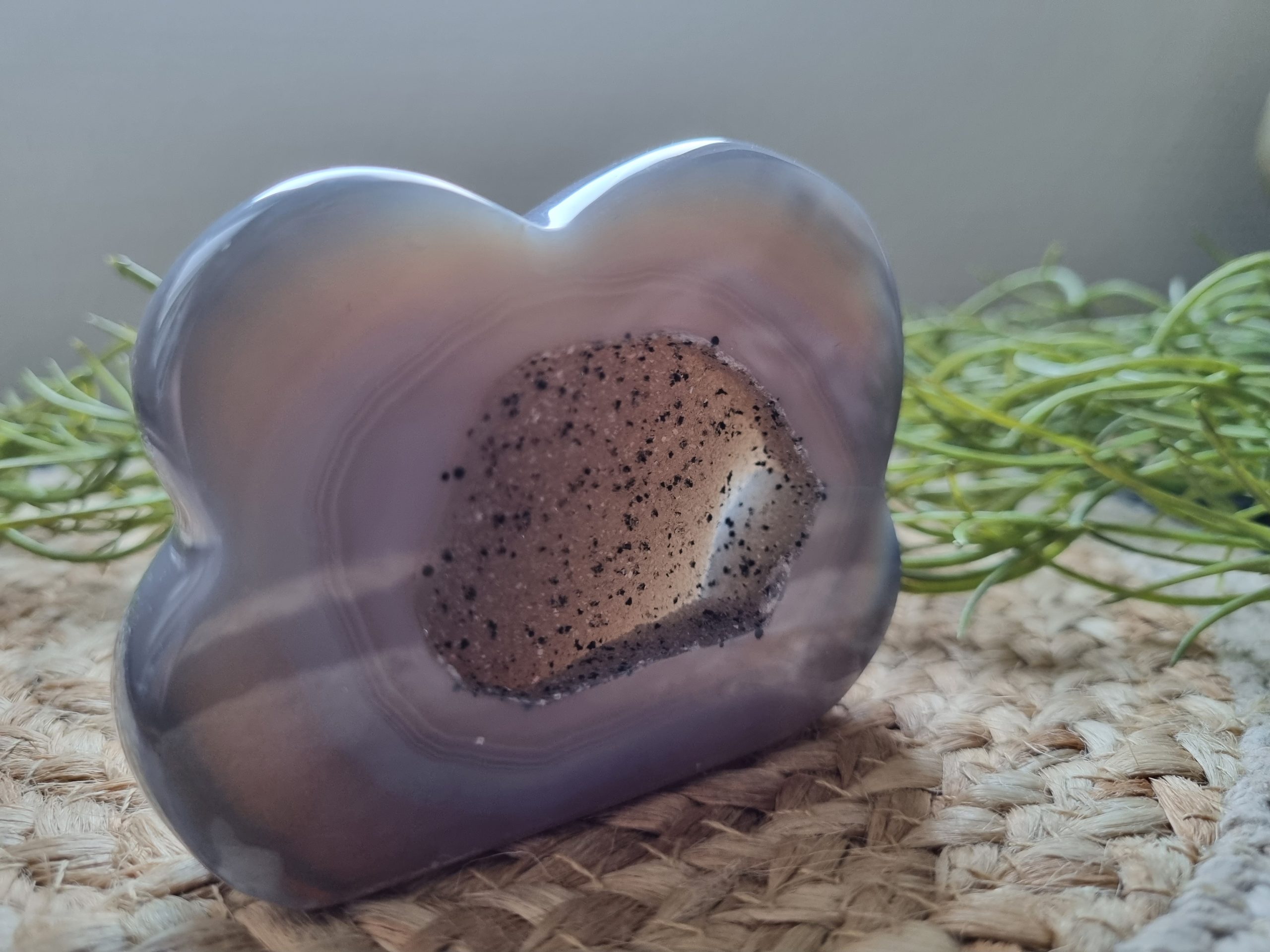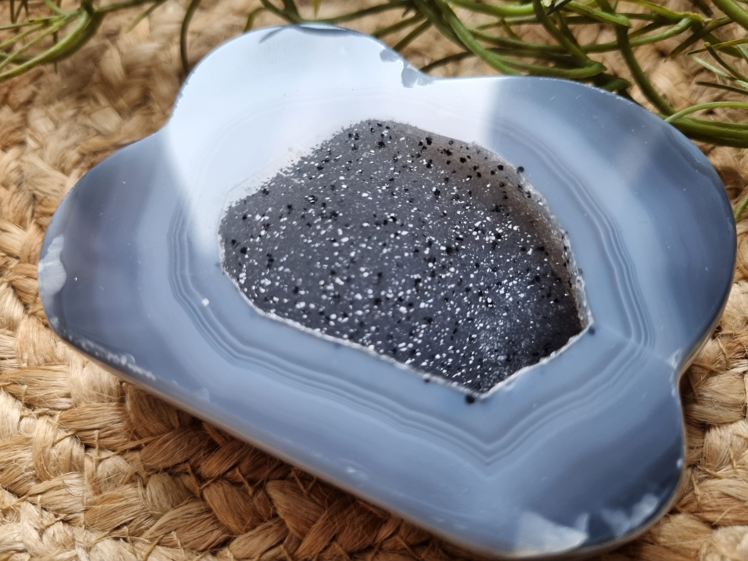 Het wolkje heeft witte en zwarte kristallen aan de binnenkant en is een uniek stuk.