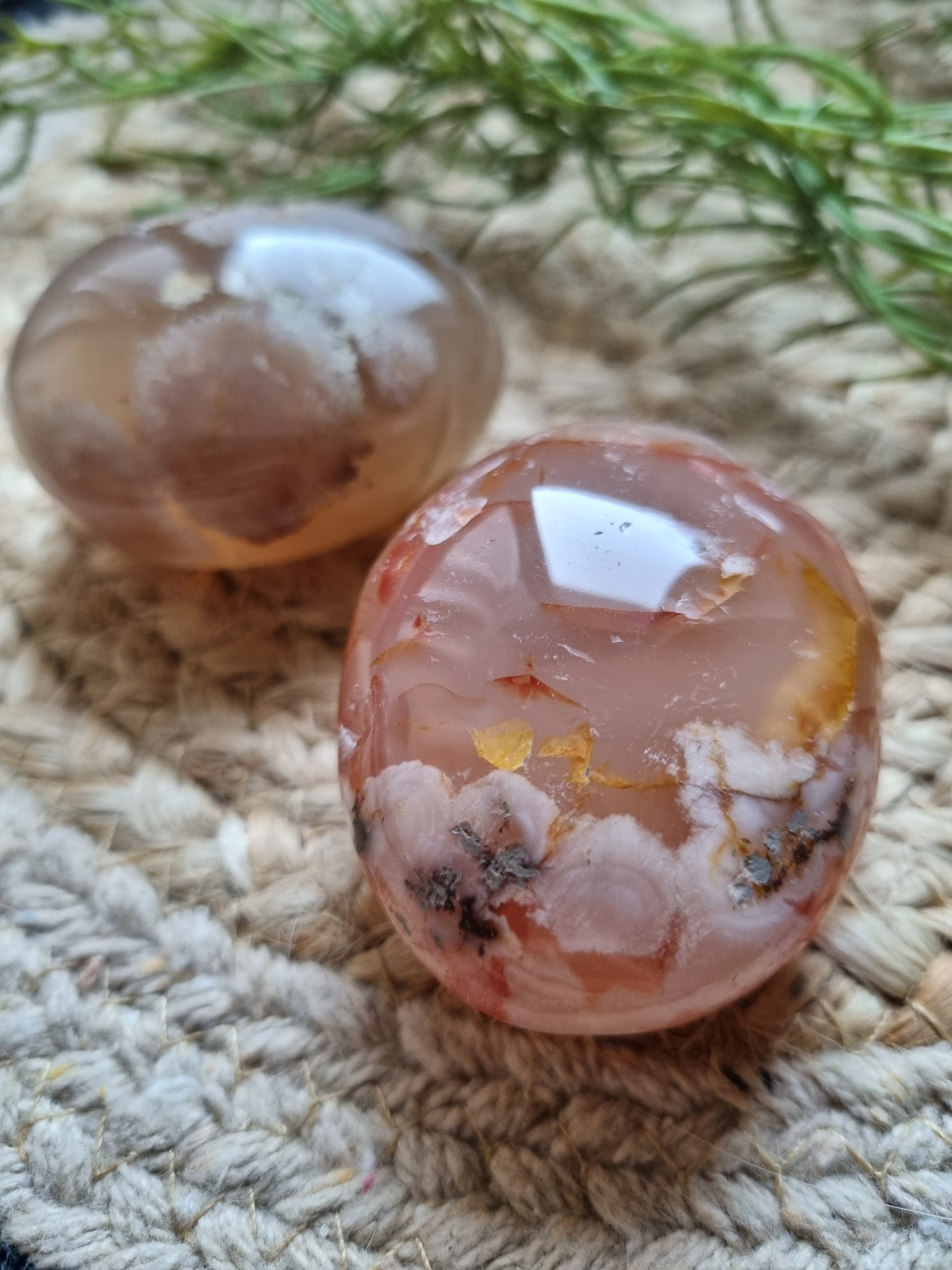 Flower agaat, ook wel bekend als bloem agaat of cherry blossom agaat, is een prachtige stenen die bekend staat om haar levendige en kleurrijke patronen die lijken op bloemblaadjes in volle bloei. Deze steen ontstaat door de langzame afzetting van silicaatmineralen in holtes en spleten van vulkanisch gesteente. De hoge druk en temperatuur tijdens haar vormingsproces zorgen voor de kenmerkende, dynamische patronen en intense kleuren die elke steen uniek maken en haar een gevoel van beweging en levendigheid geven.