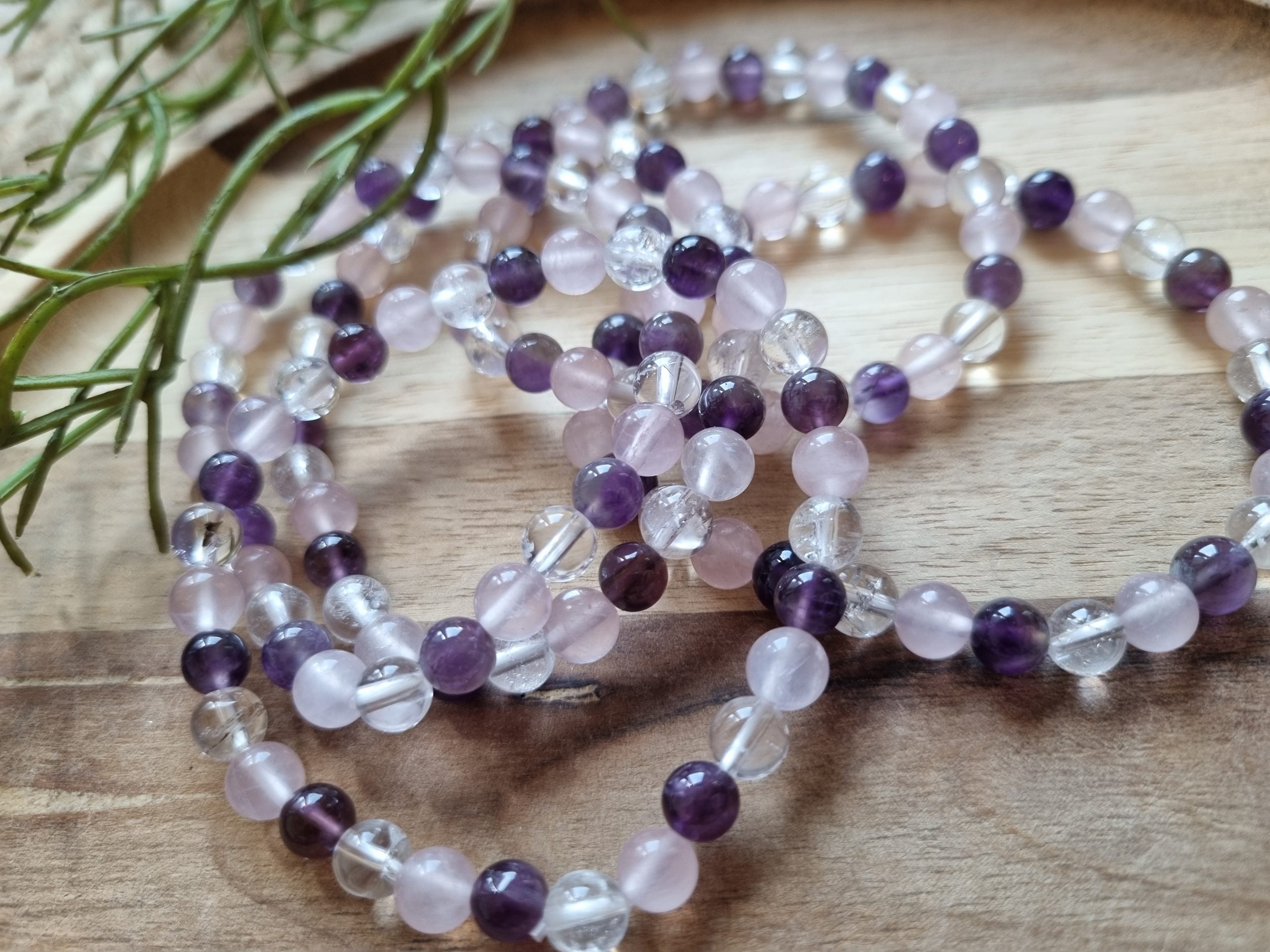 Samen vormen deze edelstenen een krachtige, harmoniserende driehoek die lichaam, geest en ziel ondersteunt. Door deze armband te dragen, kun je genieten van de helende voordelen: meer balans, een sterkere spirituele connectie en een positieve, liefdevolle energie.