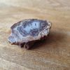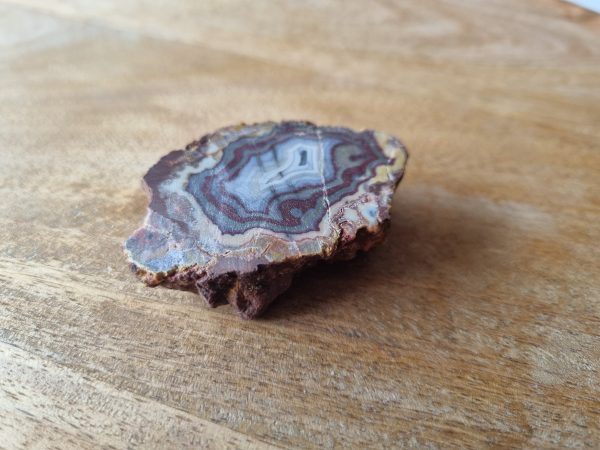 Deze agaat van 5,5 cm is half-geslepen en heeft een patroon van rode, bruine en witte strepen.