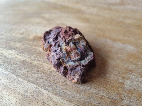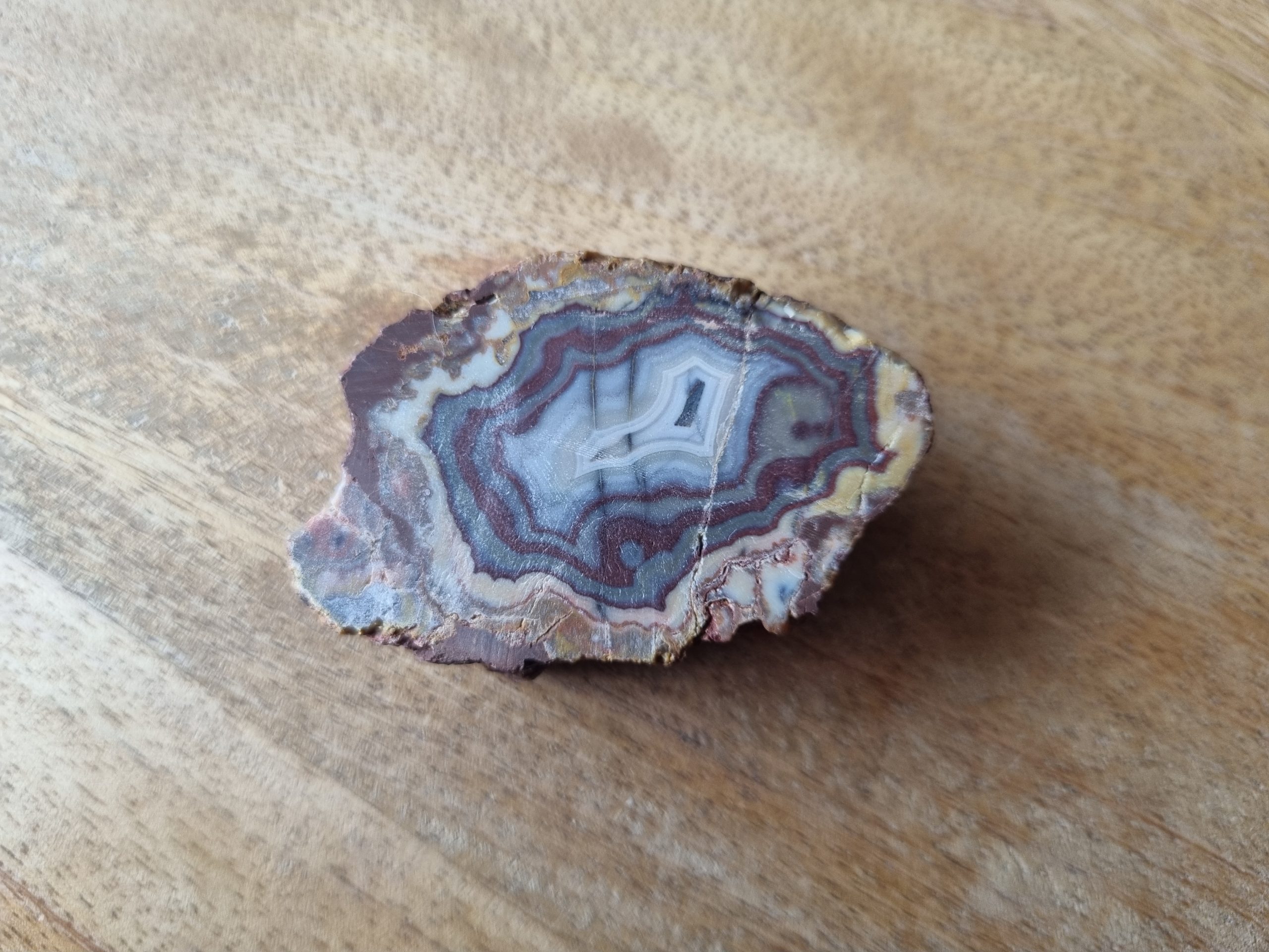 Half-geslepen agaat met rode, witte en bruine tinten.