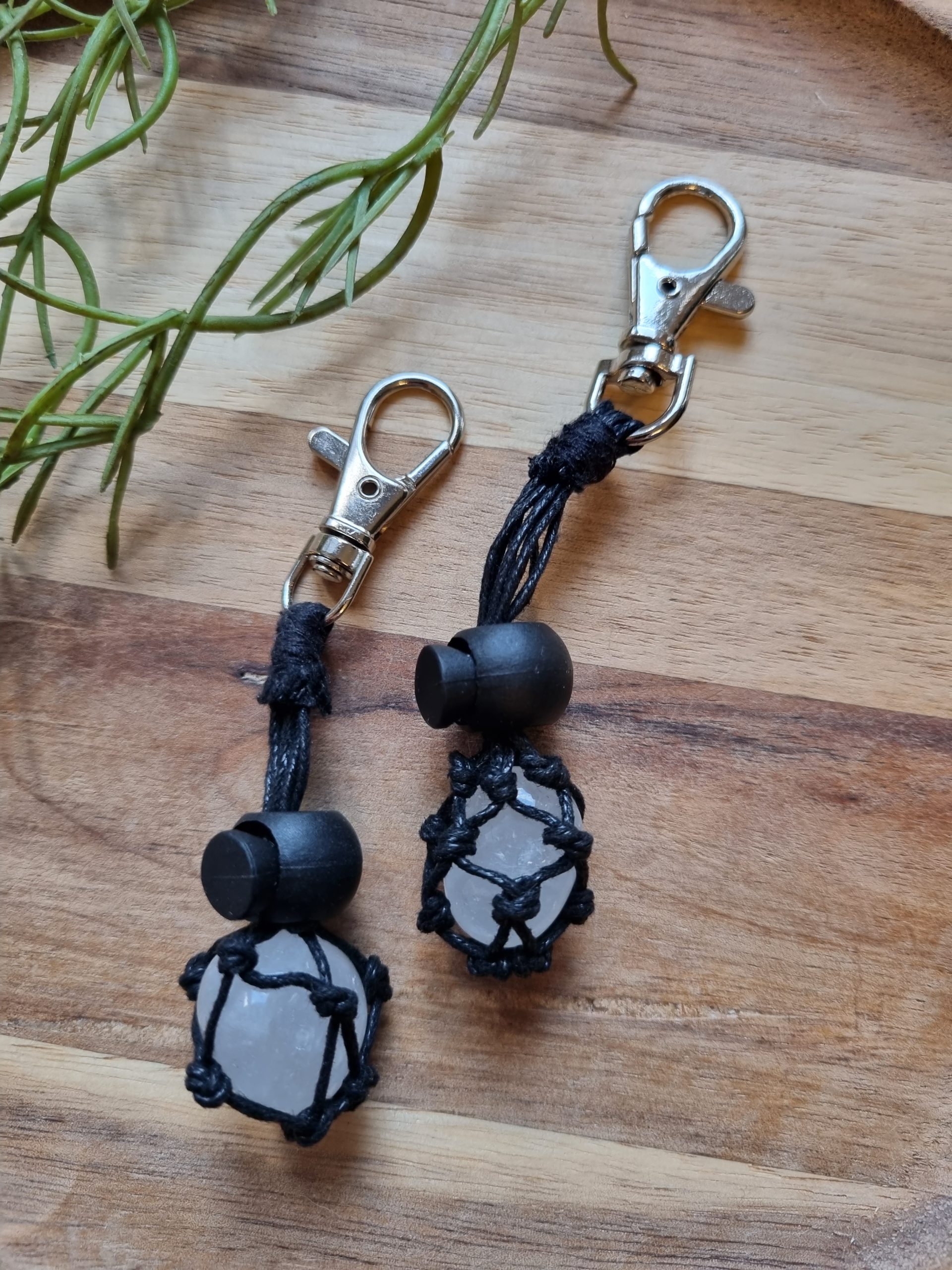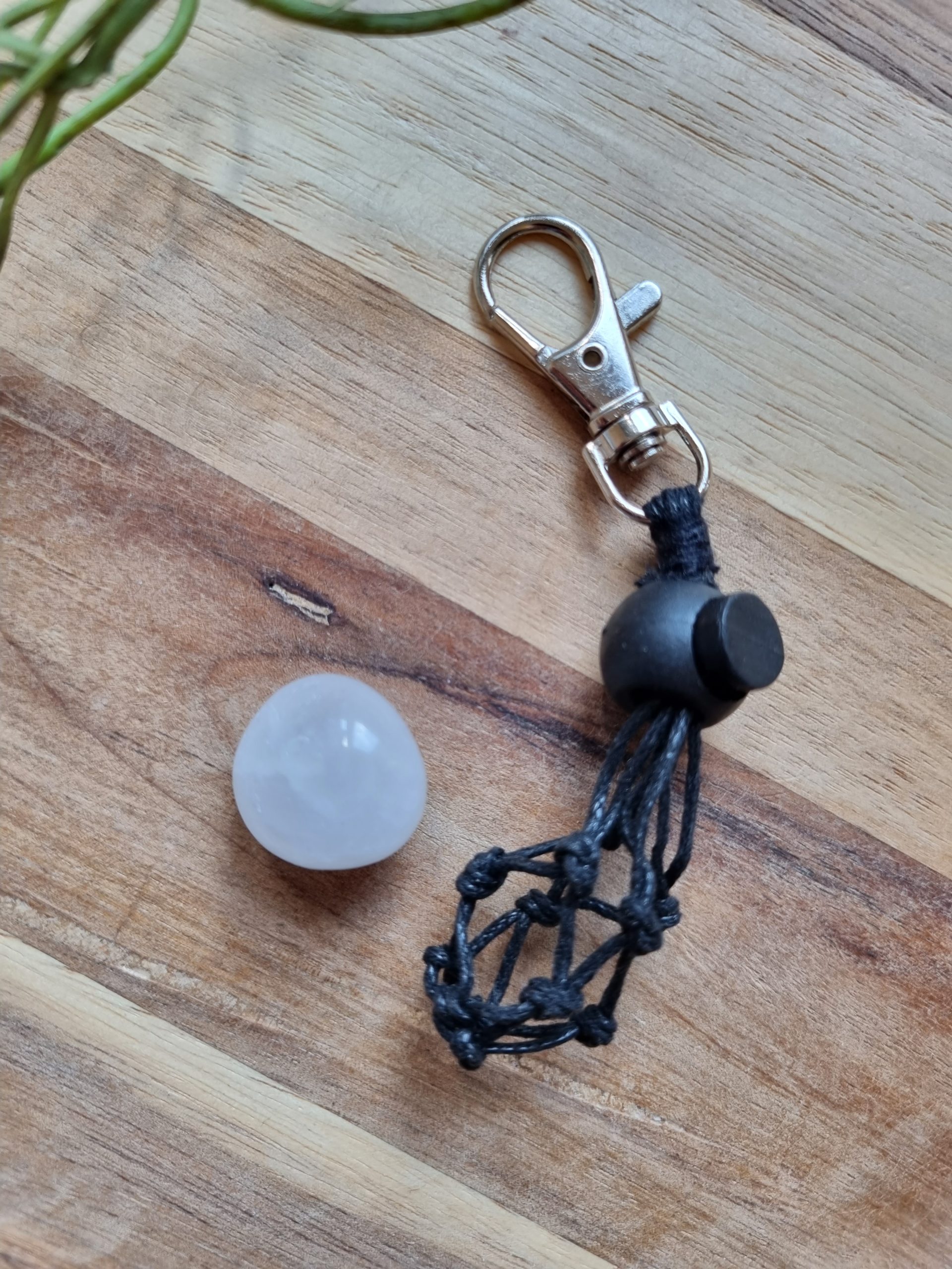 Handgemaakte macramé zakje van zwart touw met bergkristal trommelsteen. Het zakje is voorzien van een schuifknoop, zodat je de steen eenvoudig kunt vervangen, en een clip die het bevestigen aan je sleutelbos, tas of de halsband van je huisdier mogelijk maakt.