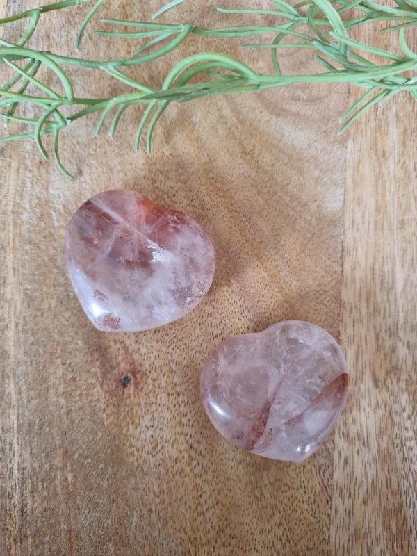 Deze hematoïde kwarts harten zijn een unieke samensmelting van helder kwarts en rijke hematietinsluitsels. De diepe, roodbruine kleur van hematiet dringt door het crystal, waardoor een betoverend gezichtsspel ontstaat van kleur en energie.