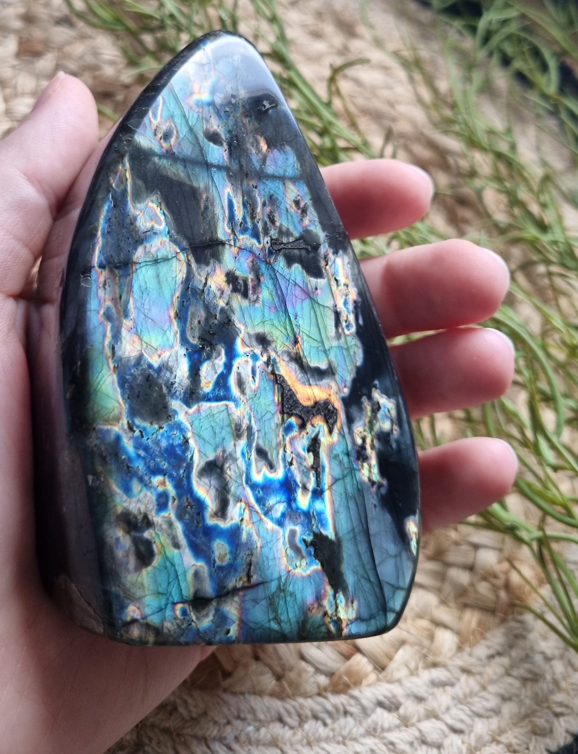 Labradoriet staat bekend om haar krachtige energetische eigenschappen. Ze wordt vaak gezien als een steen van bescherming en spirituele groei, die negatieve energie afweert en emotionele balans ondersteunt.