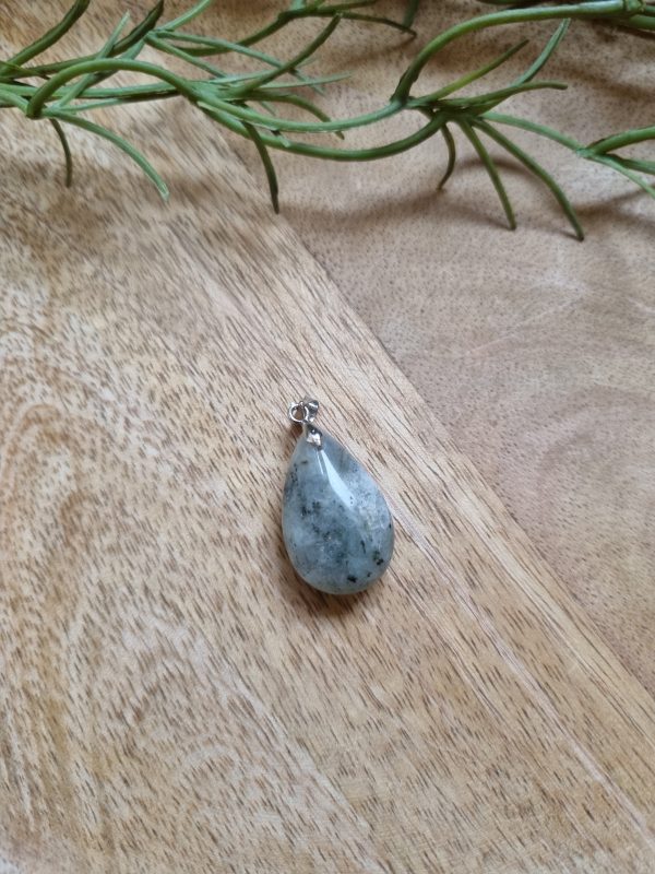 Deze labradoriet druppelhanger, met haar betoverende kleurenspel en zilverkleurig oogje voor eenvoudige bevestiging, is een krachtig symbool van bescherming en intuïtie.
