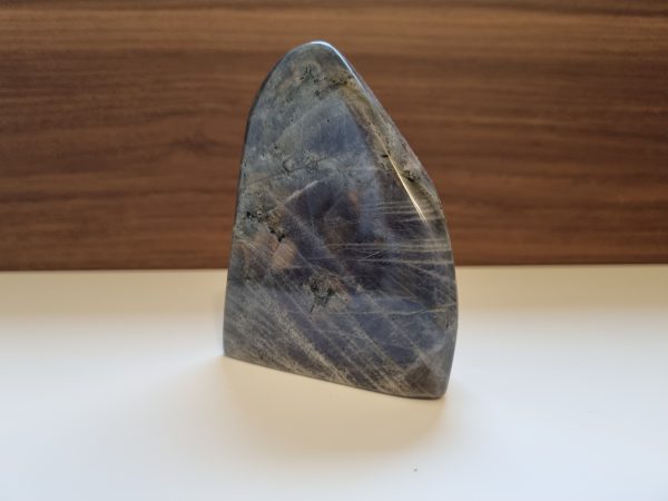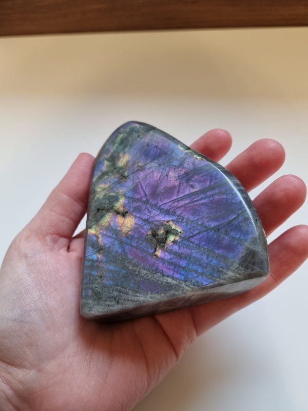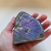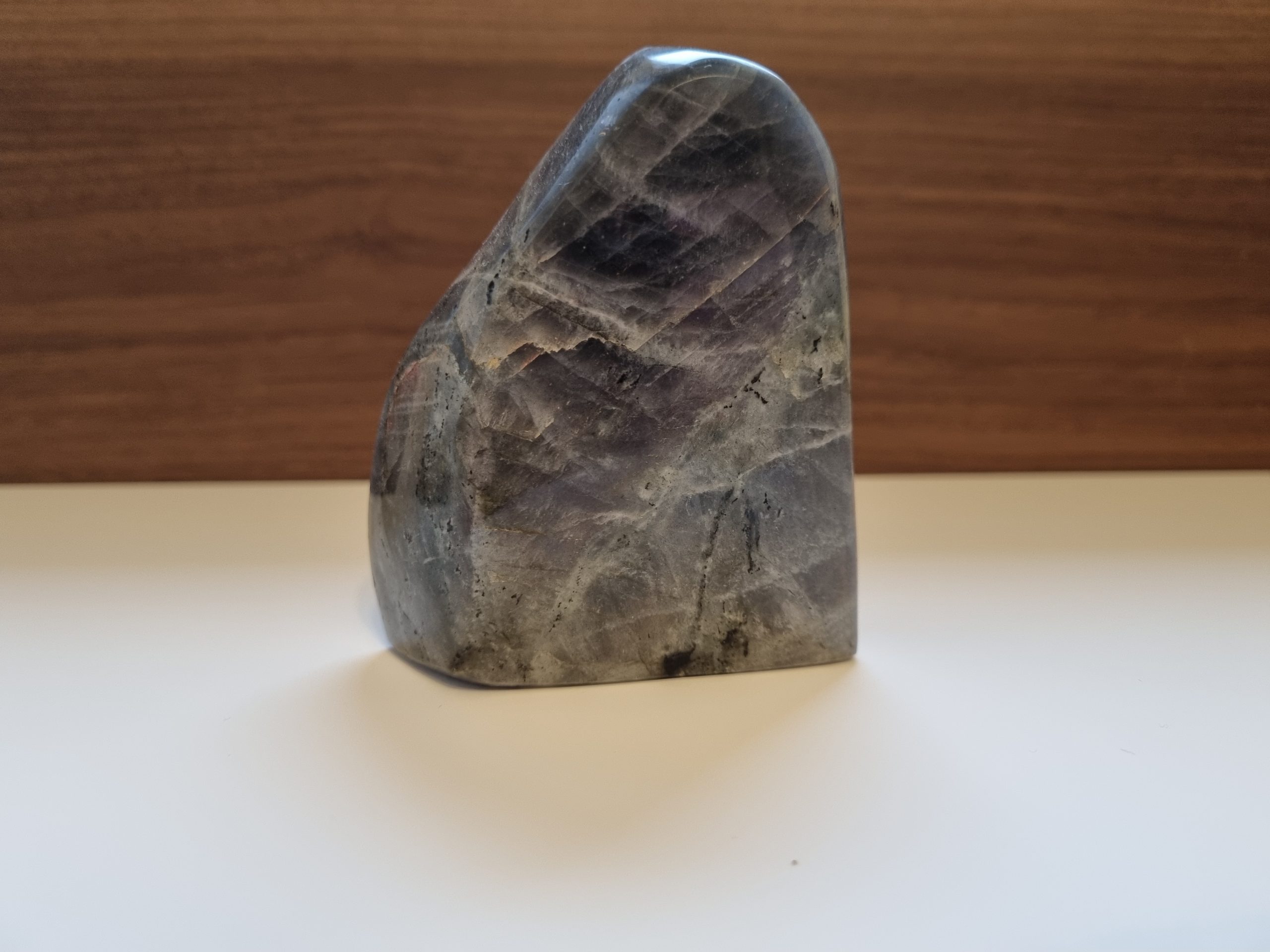 Deze labradoriet sculptuur weegt 400 gram en heeft een mooi paarse kleur.