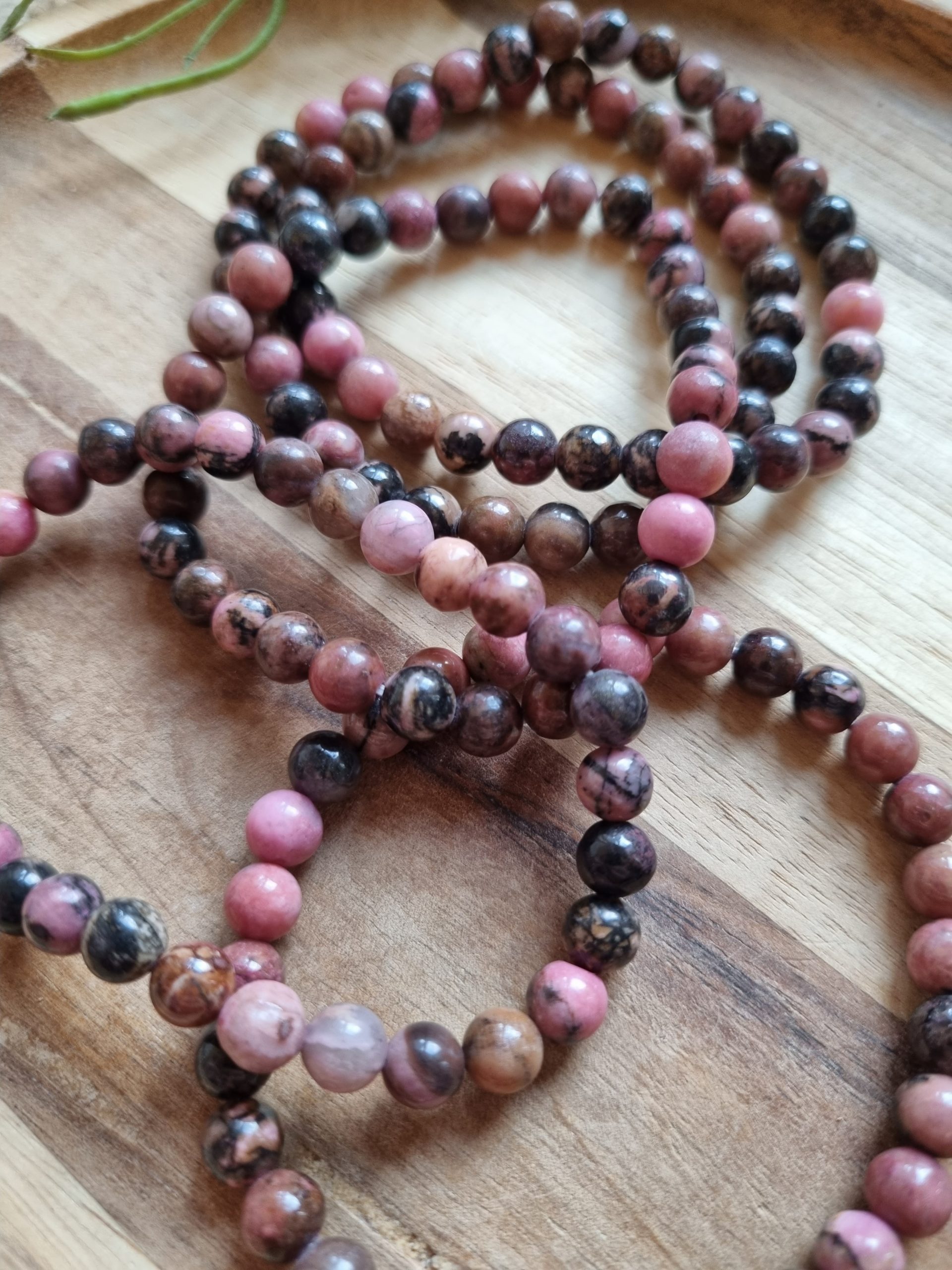 Deze rhodoniet armband bestaat uit gladde 6mm kralen met een opvallende mix van roze en zwarte tinten. Rhodoniet staat bekend om haar helende en balancerende eigenschappen. Ze helpt bij het verwerken van emotionele pijn, versterkt zelfliefde, en stimuleert compassie en vergevingsgezindheid. Daarnaast bevordert ze harmonie in relaties en brengt een gevoel van vrede en stabiliteit. Draag deze armband als een krachtig symbool van heling, liefde en innerlijke balans, en herinner jezelf aan het belang van zelfzorg en verbondenheid met anderen.
