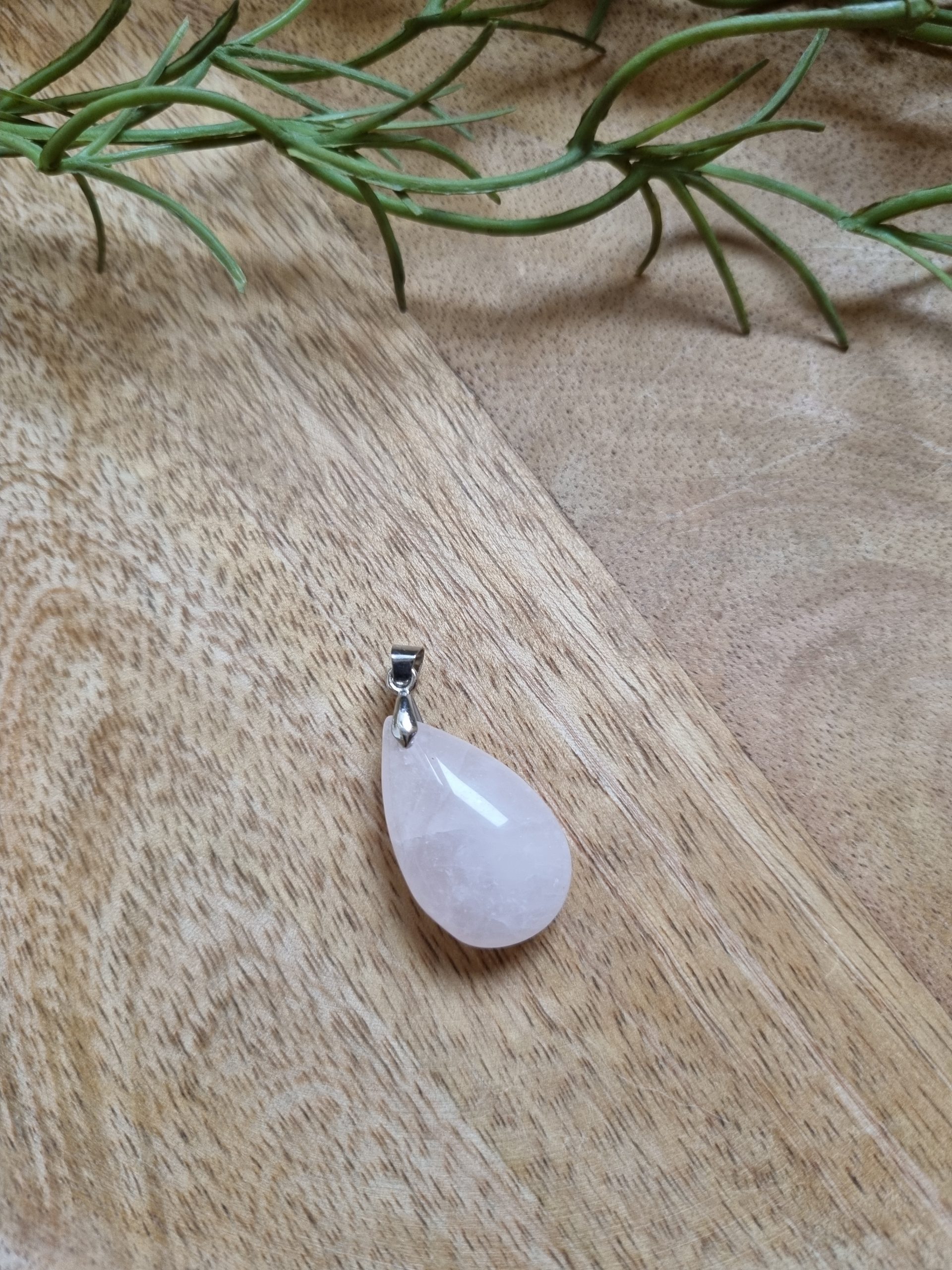 Een druppelvormige rozenkwarts hanger die haar liefdevolle en kalmerende energie in jouw dagelijks leven brengt.