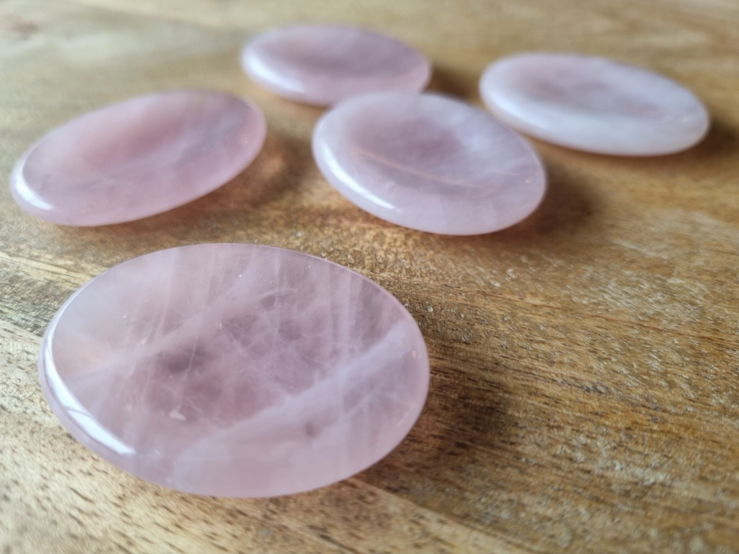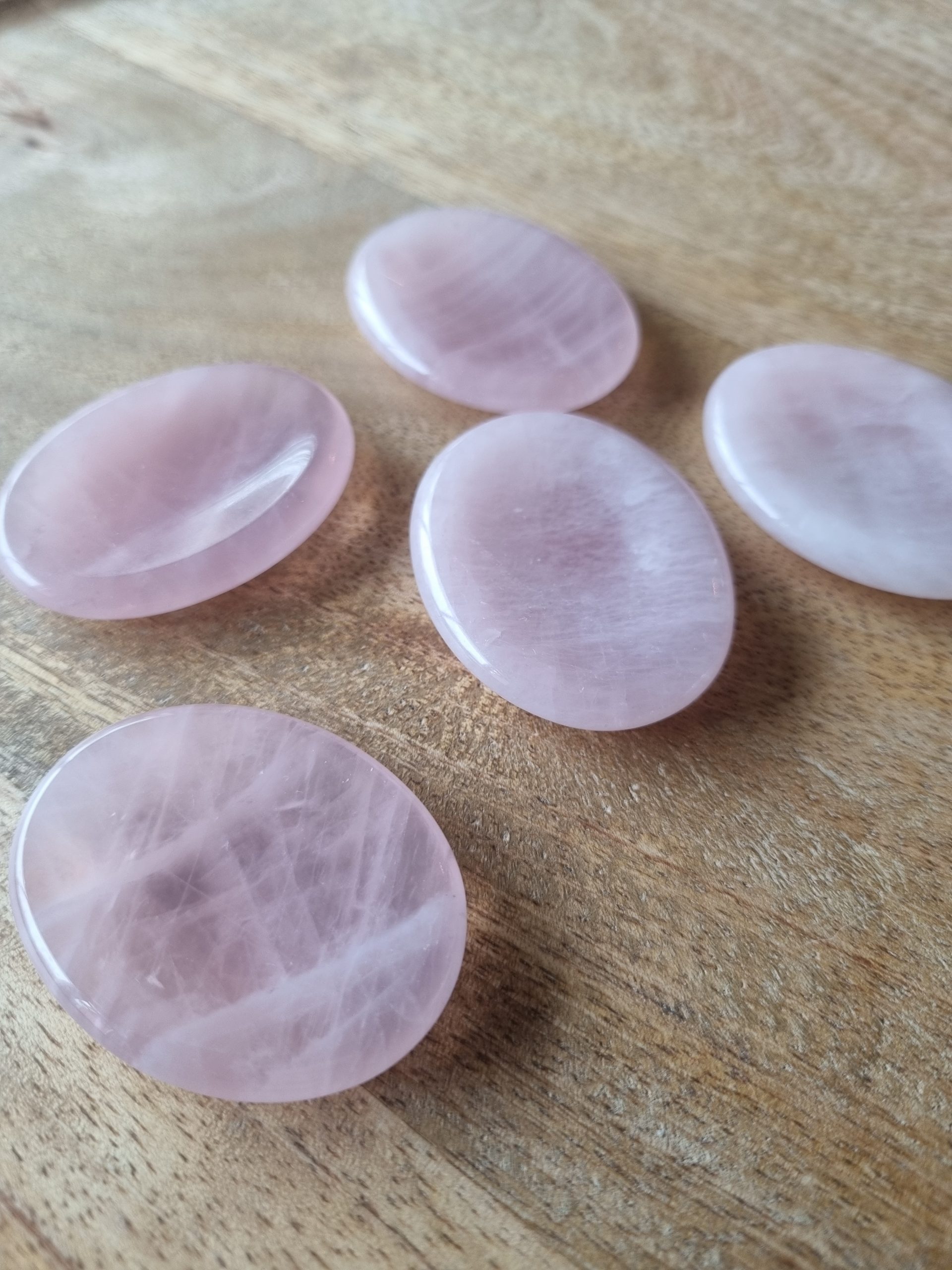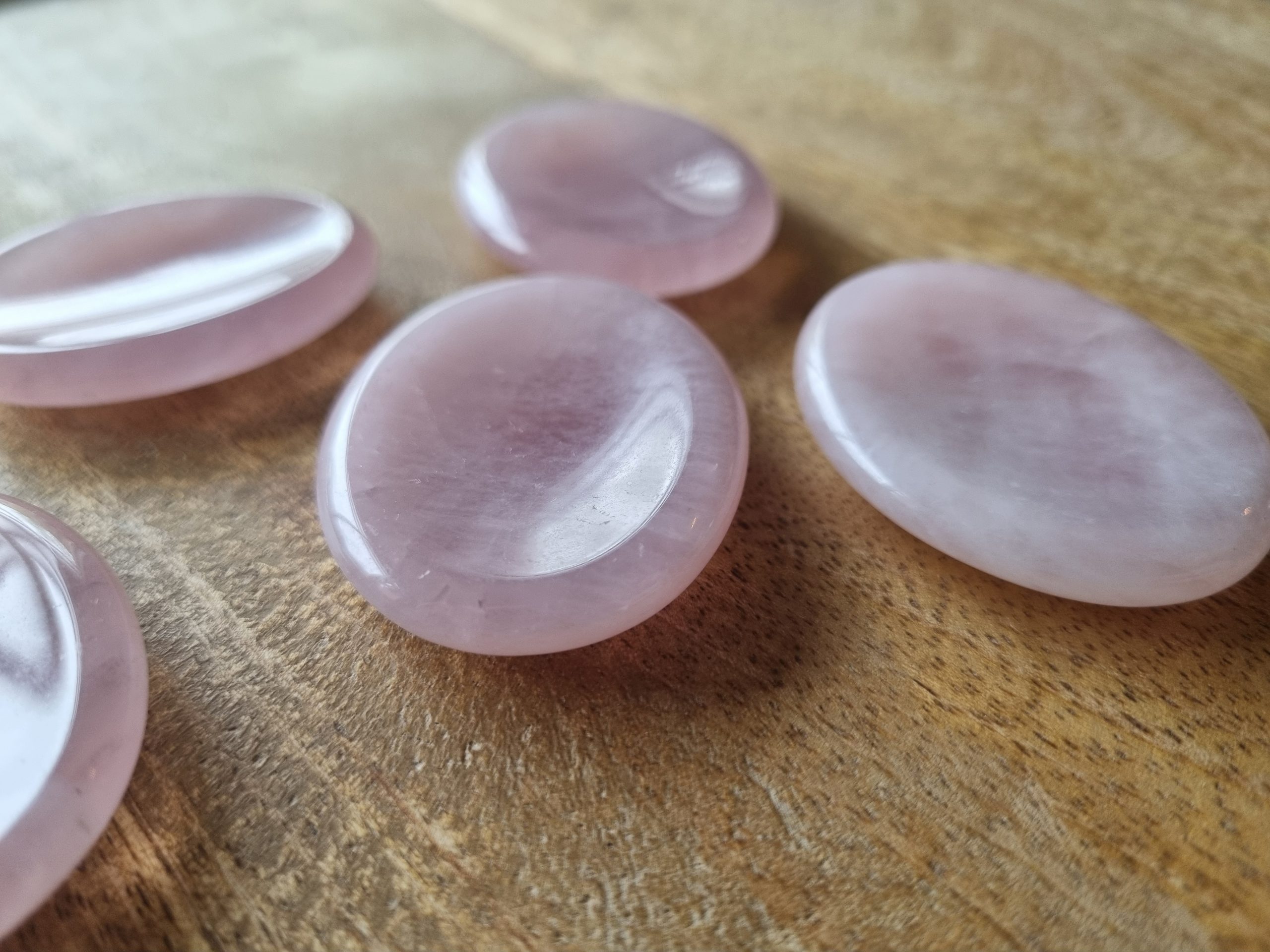 Deze ovale rozenkwarts duimsteen, voorzien van een zacht afgerond kuiltje voor de duim, is een mooi en krachtig hulpmiddel voor stressverlichting en meditatie.