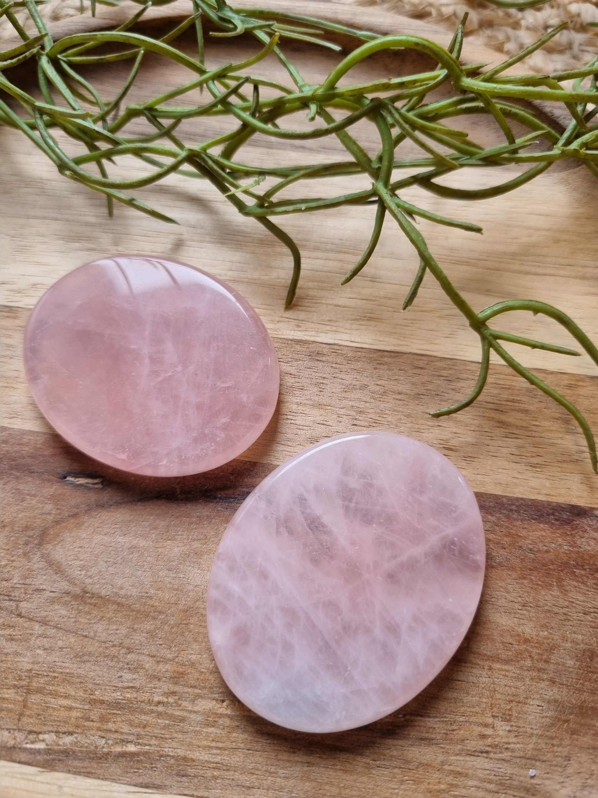 Deze plat geslepen rozenkwarts zakstenen stralen een zachte roze kleur en kalmerende energie uit. Ze zijn perfect om mee te nemen in je zak of tas, zodat je altijd de liefdevolle kracht van rozenkwarts bij je hebt.