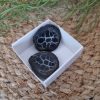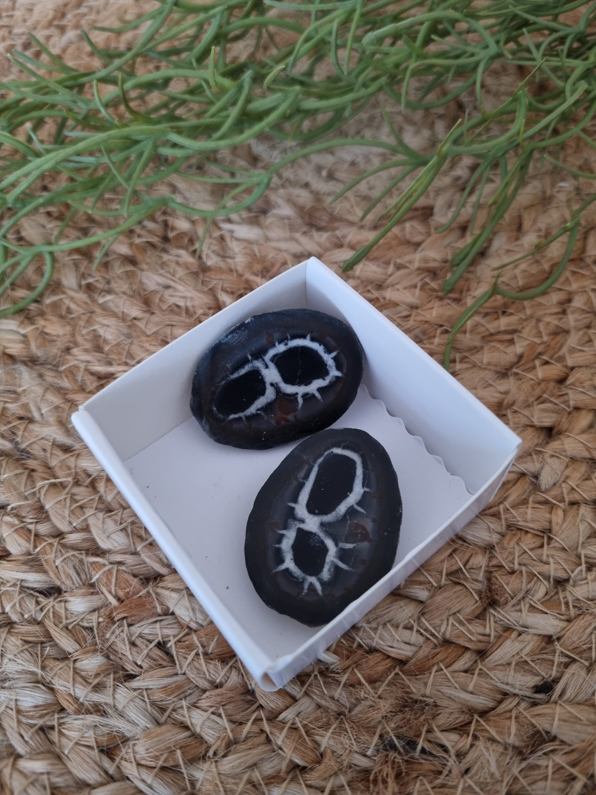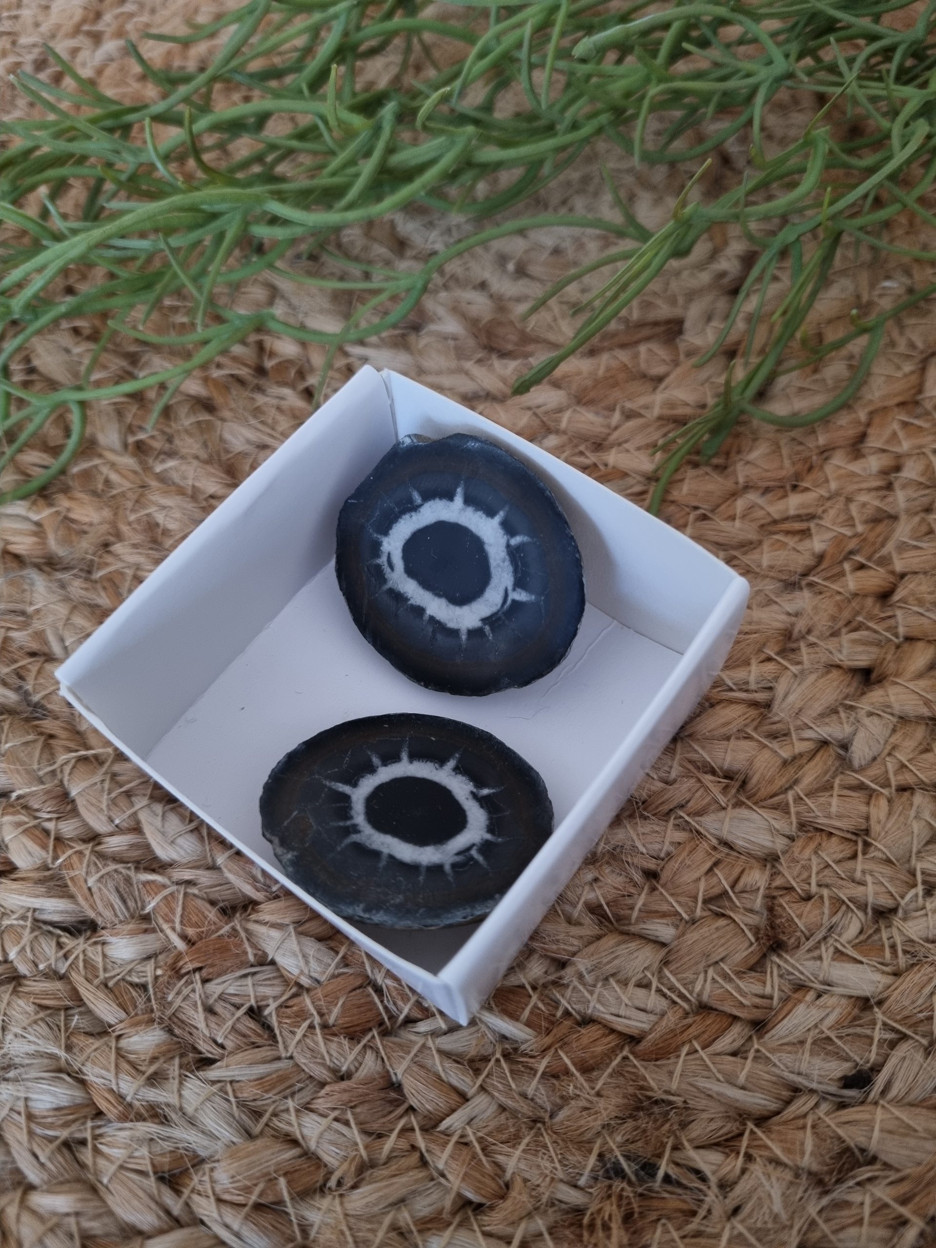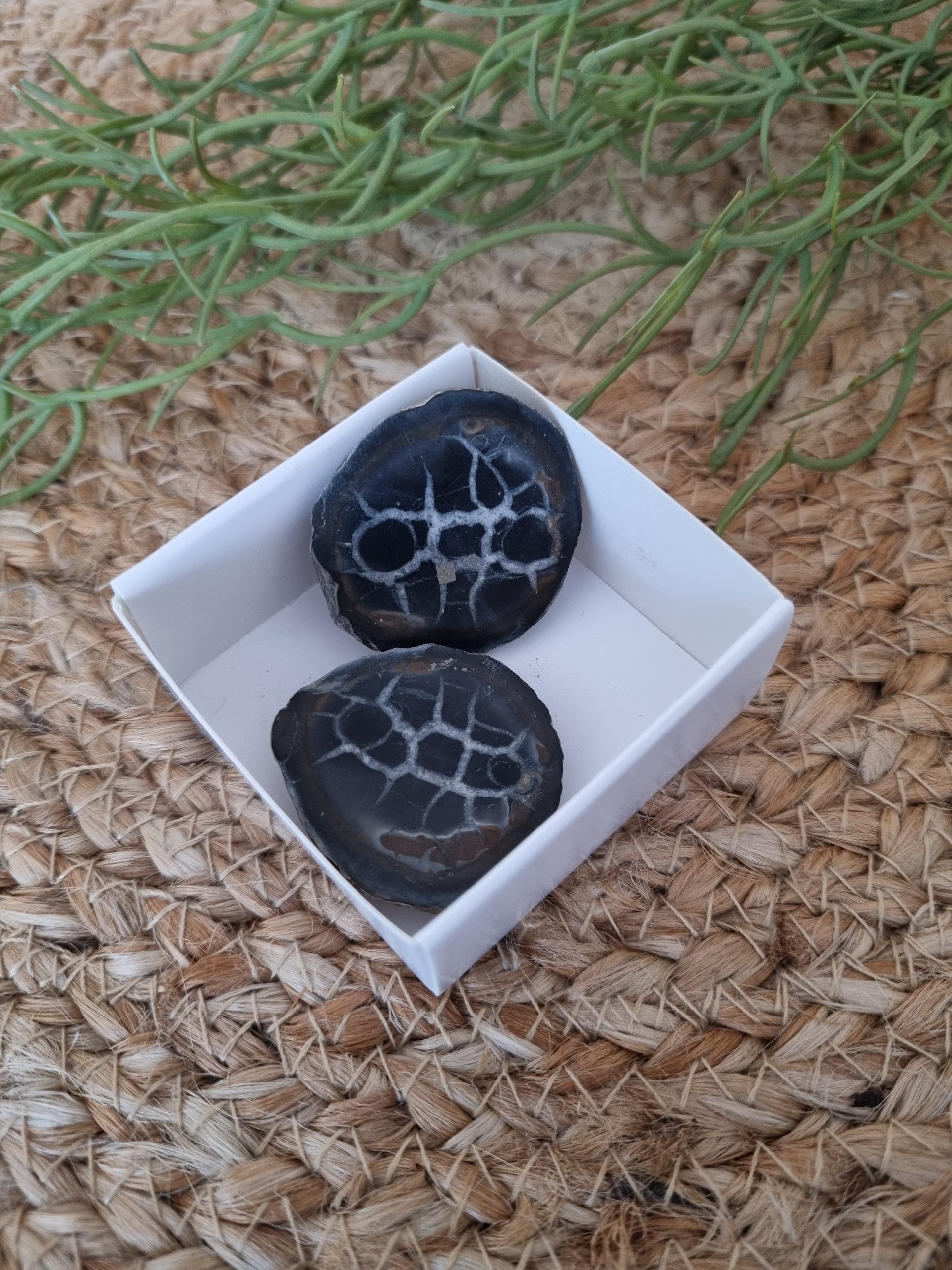 Het septarie geode paar is een prachtig en matchend duo van geoden met een opvallend zwart-wit uiterlijk. Deze geoden hebben een ruwe buitenkant, maar aan één zijde zijn ze zorgvuldig gepolijst, waardoor het unieke patroon van donkere en lichte banden nog beter zichtbaar wordt.
